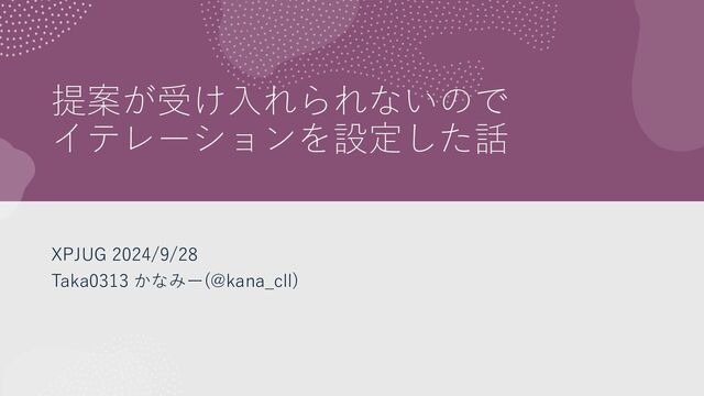 提案が受け入れられないので イテレーションを設定した話 XPJUG 2024/9/28 Taka0313 かなみー(@kana_cll)