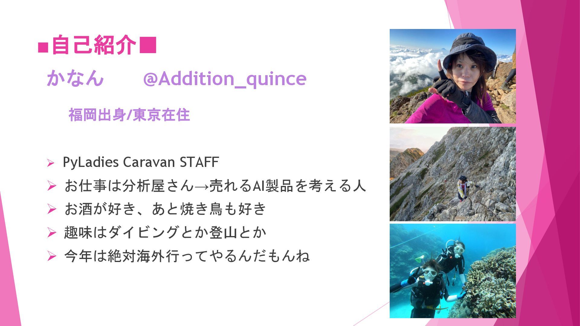 趣味はダイビングとか登山とか ➢ 今年は絶対海外行ってやるんだもんね かなん @Addition_quince 福岡出身/東京在住