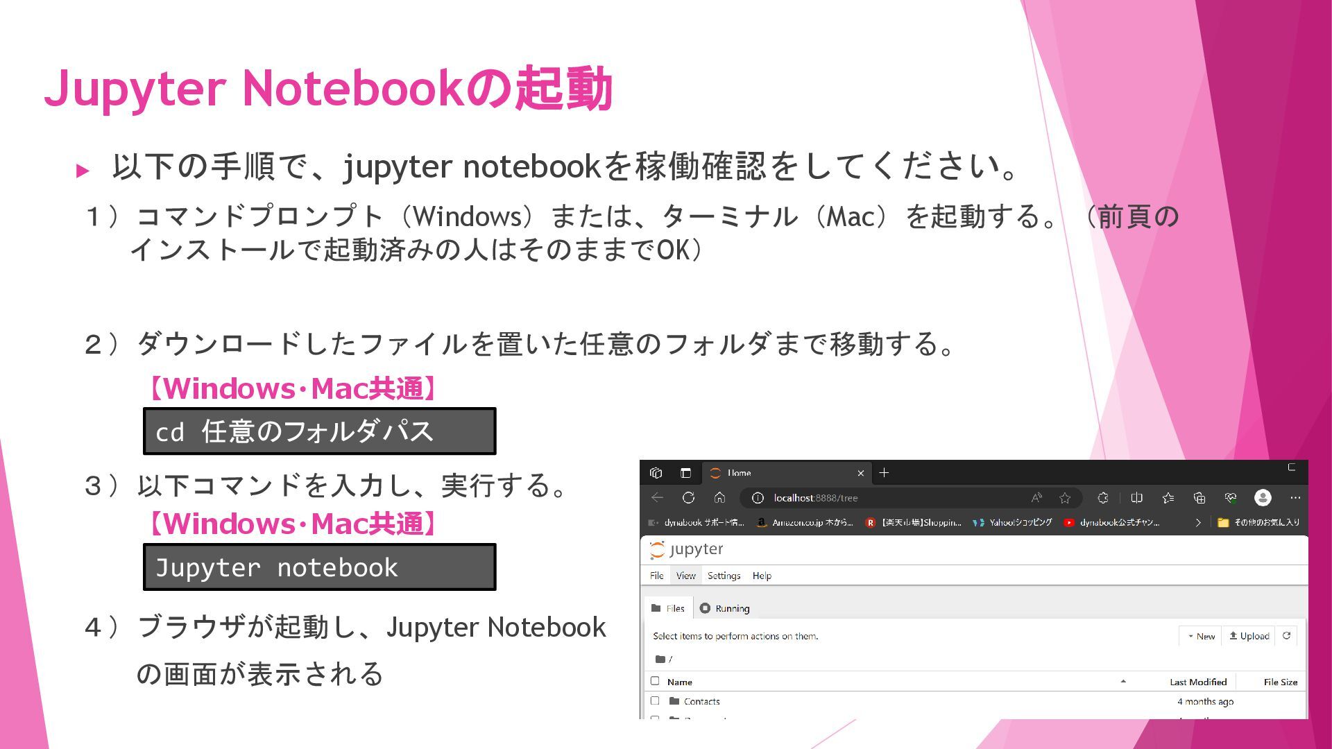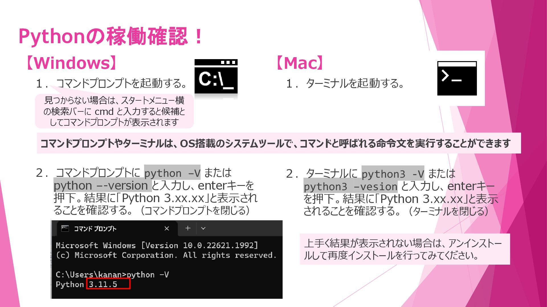押下。結果に「Python 3.xx.xx」と表示され ることを確認する。(コマンドプロンプトを閉じる) 【Mac】 1.ターミナルを起動する。 2.ターミナルに python3 -V または python3 –vesion と入力し、enterキー を押下。結果に「Python 3.xx.xx」と表示 されることを確認する。(ターミナルを閉じる) コマンドプロンプトやターミナルは、OS搭載のシステムツールで、コマンドと呼ばれる命令文を実行することができます 見つからない場合は、スタートメニュー横 の検索バーに cmd と入力すると候補と してコマンドプロンプトが表示されます 上手く結果が表示されない場合は、アンインストー ルして再度インストールを行ってみてください。