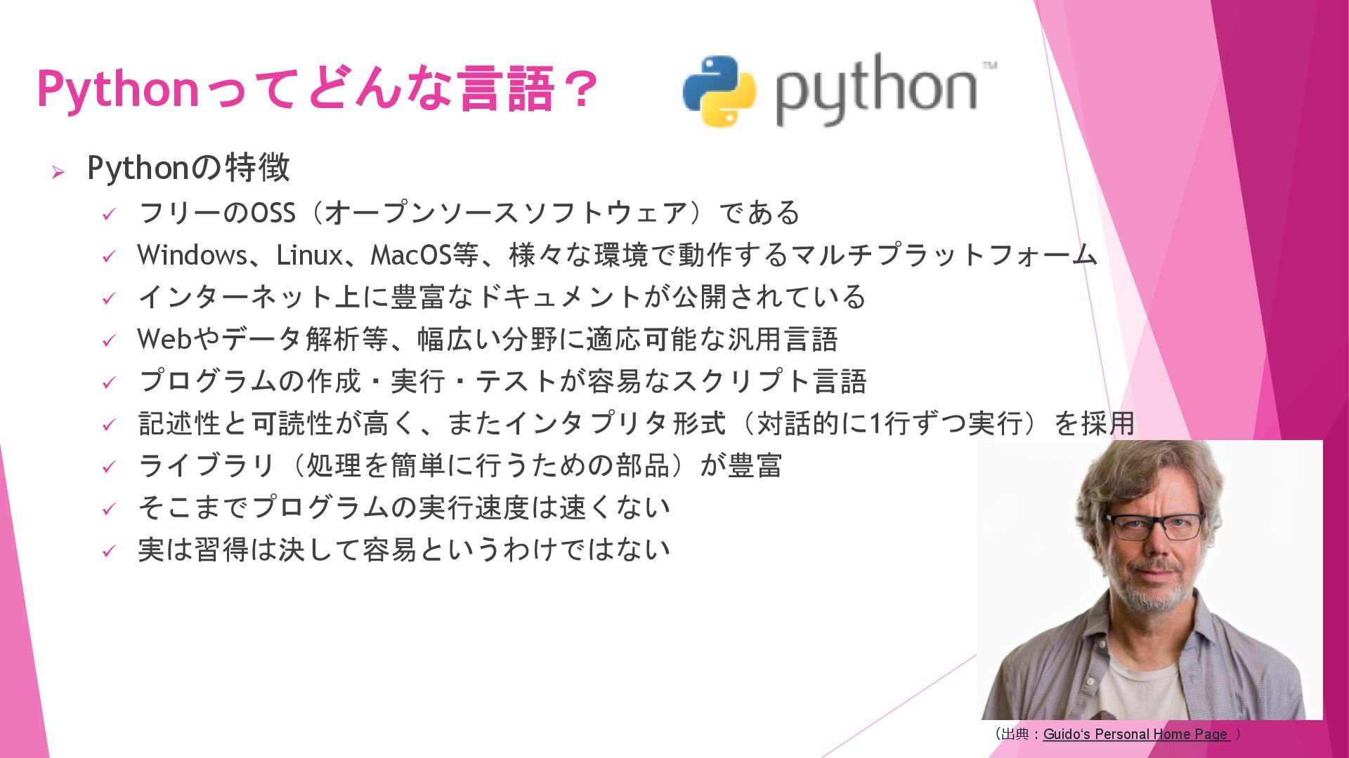2. ➢ コンピュータが処理を行う際には、コンピュータを動作 させるための命令で構成される何らかのプログラムが動 いている。このプログラムを記述するための言語がプロ グラミング言語である。 ➢ 開発者はオランダ出身のグイド・ヴァン・ロッサム (Guido van Rossum)氏。