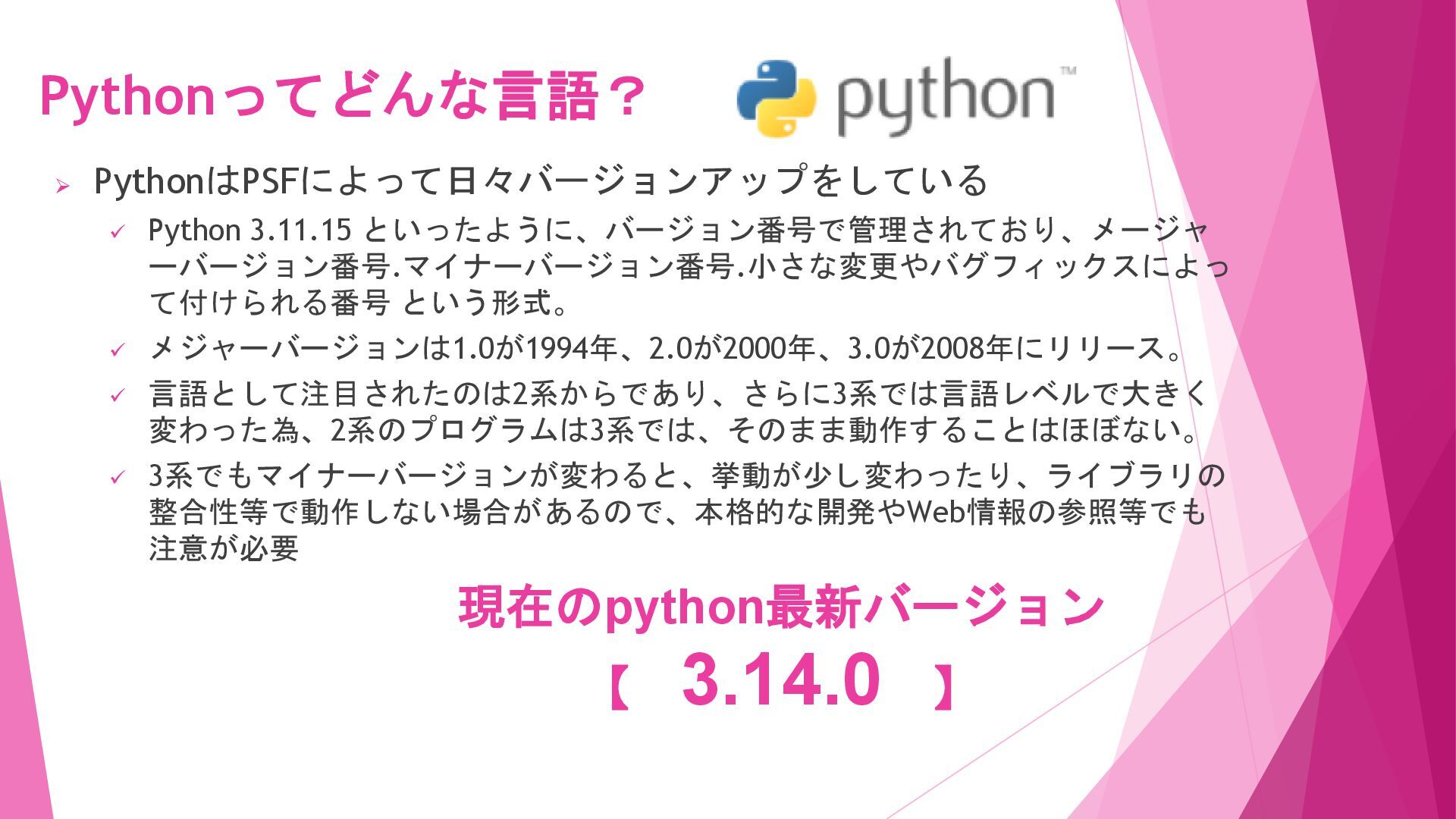 メジャーバージョンは1.0が1994年、2.0が2000年、3.0が2008年にリリース。 ✓ 言語として注目されたのは2系からであり、さらに3系では言語レベルで大きく 変わった為、2系のプログラムは3系では、そのまま動作することはほぼない。 ✓ 3系でもマイナーバージョンが変わると、挙動が少し変わったり、ライブラリの 整合性等で動作しない場合があるので、本格的な開発やWeb情報の参照等でも 注意が必要 Pythonってどんな言語? 現在のpython最新バージョン 【 3.14.0 】