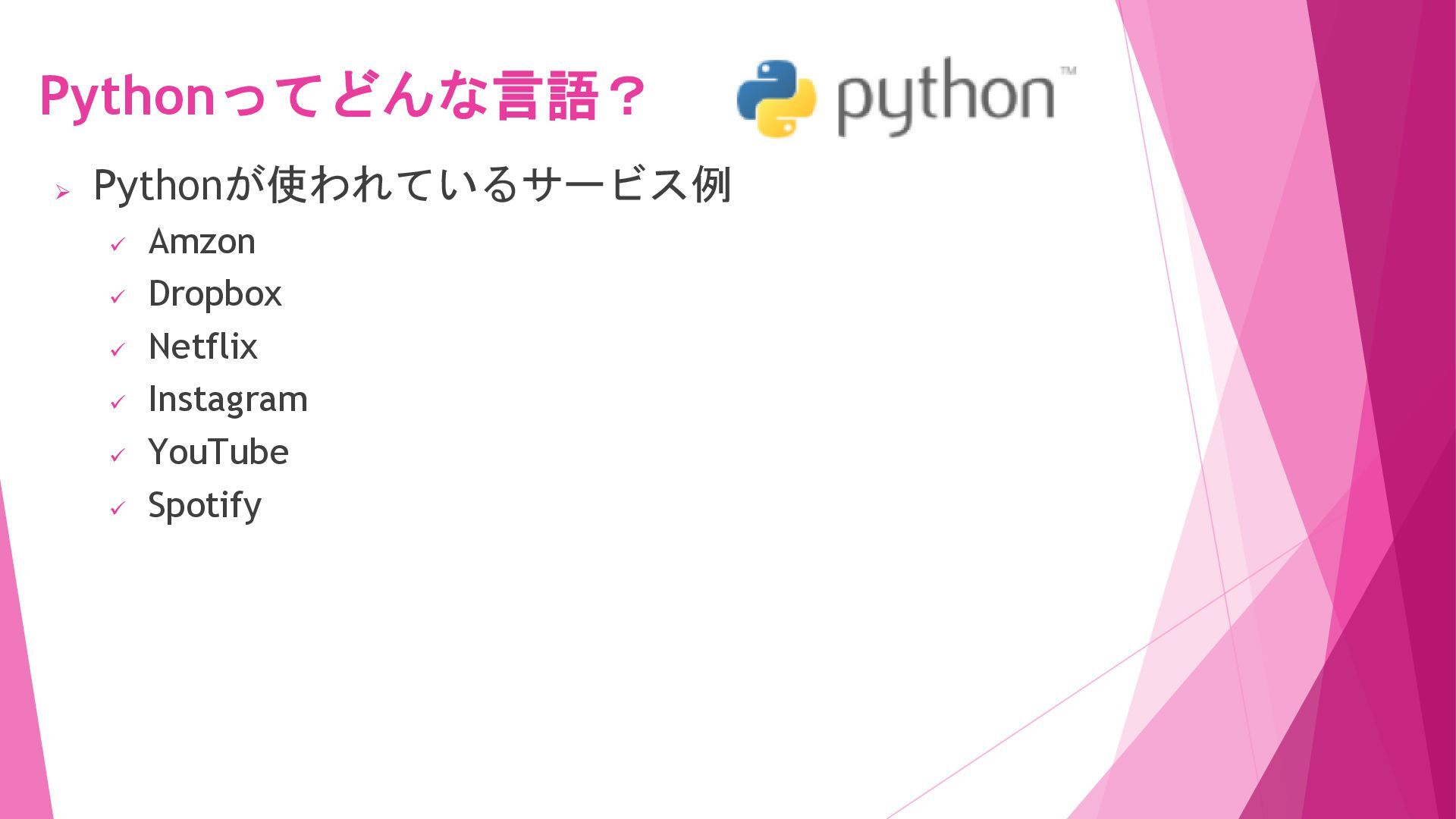 ✓ Pythonという名前の由来は、イギリスのテレビ局BCCが製作し たコメディ番組である『空飛ぶモンティ・パイソン』をグイド 氏が好きで、この番組にちなんで付けられた。但し、ロゴは Python(蛇)が使われている。 ➢ Pythonの開発や維持は、Pythonソフトウェア財団 (Python Software Foundation)が実施。 (出典:Guido‘s Personal Home Page ) Pythonってどんな言語?