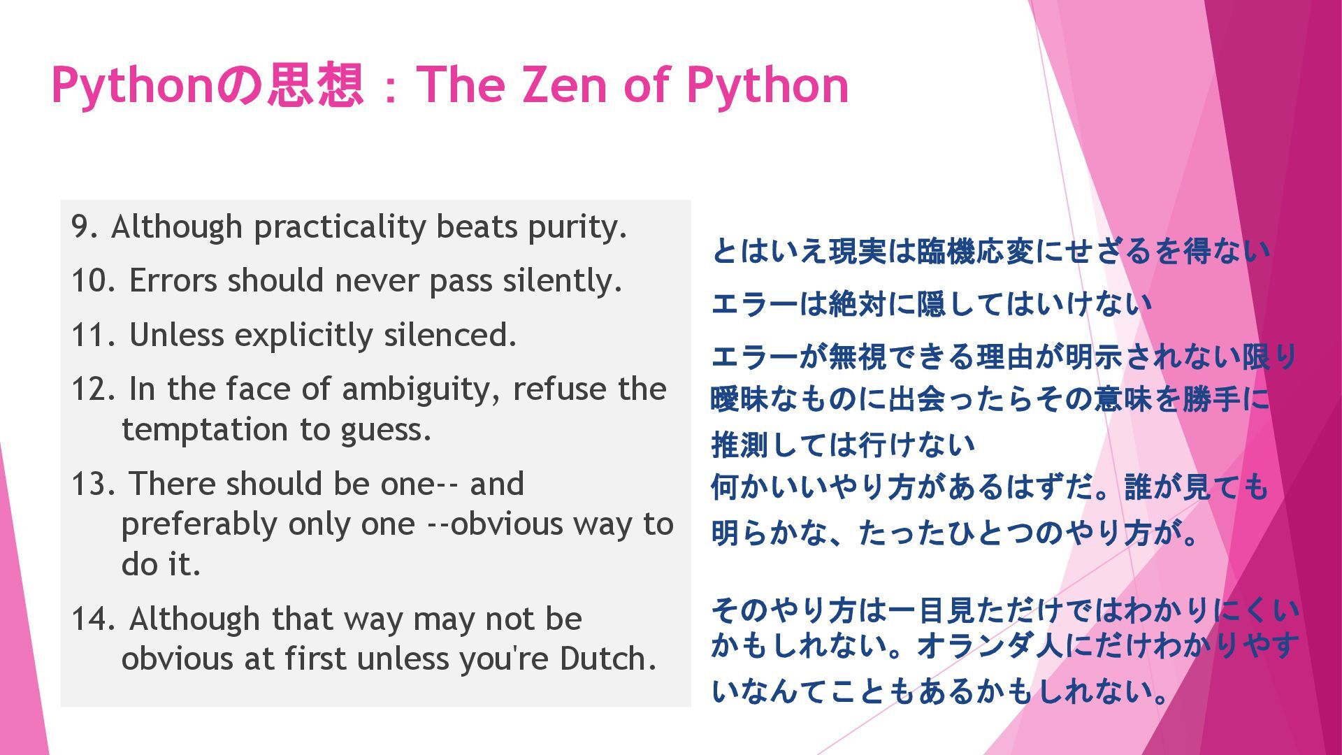 Errors should never pass silently. 11. Unless explicitly silenced. 12. In the face of ambiguity, refuse the temptation to guess. 13. There should be one-- and preferably only one --obvious way to do it. 14. Although that way may not be obvious at first unless you're Dutch. とはいえ現実は臨機応変にせざるを得ない エラーは絶対に隠してはいけない エラーが無視できる理由が明示されない限り 曖昧なものに出会ったらその意味を勝手に 推測しては行けない 何かいいやり方があるはずだ。誰が見ても 明らかな、たったひとつのやり方が。 そのやり方は一目見ただけではわかりにくい かもしれない。オランダ人にだけわかりやす いなんてこともあるかもしれない。