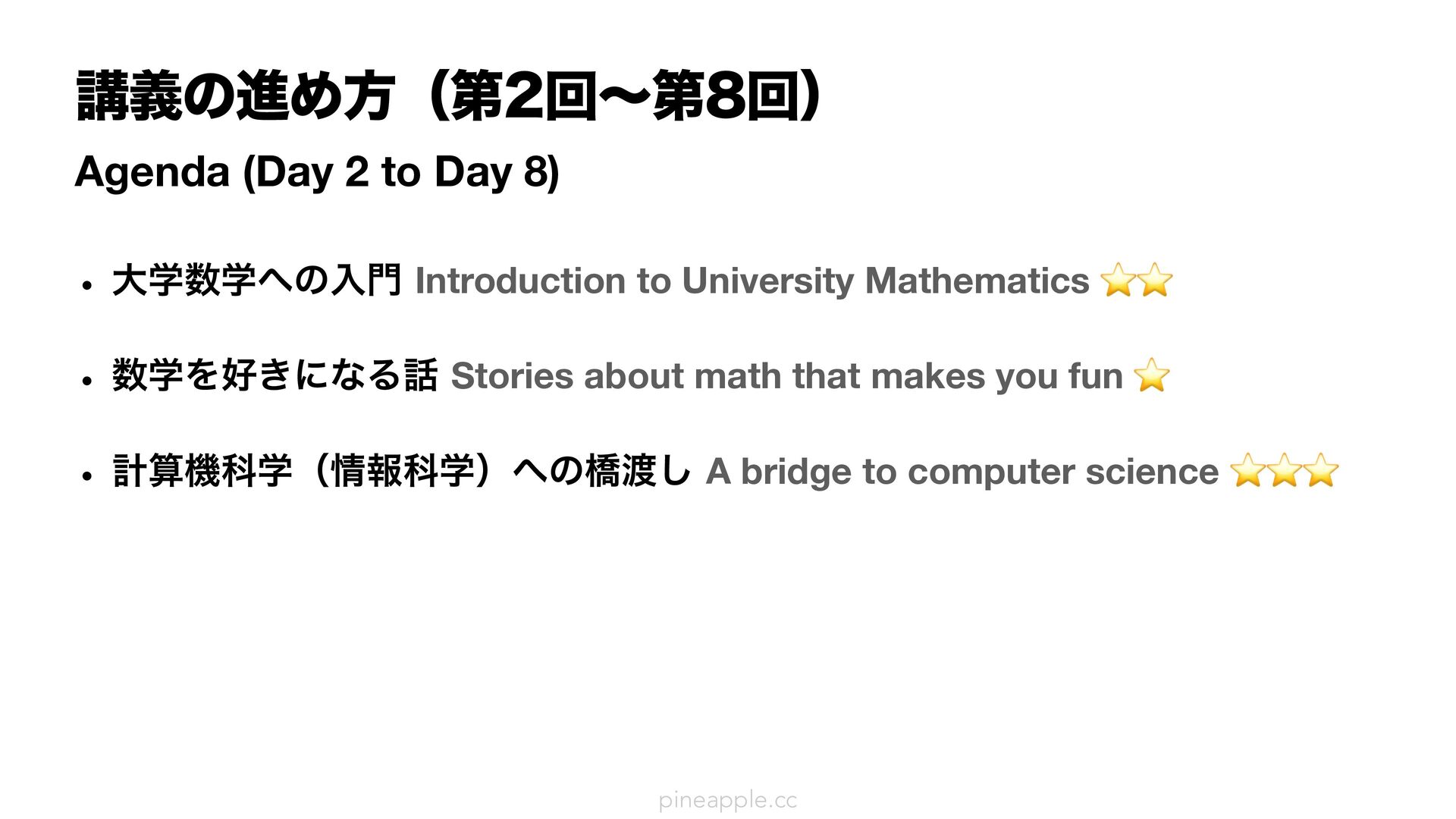 to University Mathematics ⭐⭐ w ֶΛ͖ʹͳΔStories about math that makes you fun ⭐ w ܭࢉػՊֶʢใՊֶʣͷڮ͠A bridge to computer science ⭐⭐⭐