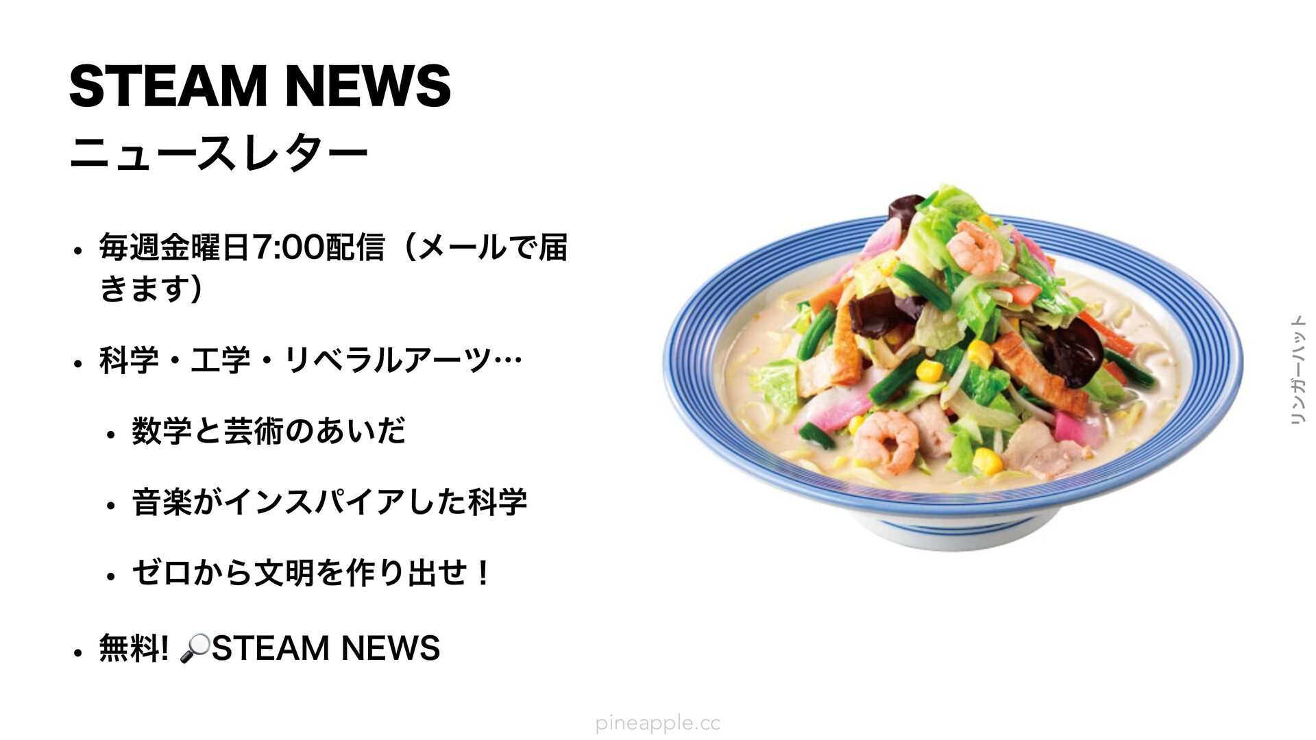 pineapple.cc χϡʔεϨλʔ w ຖि༵ۚ৴ʢϝʔϧͰಧ ͖·͢ʣ w ՊֶɾֶɾϦϕϥϧΞʔπʜ w ֶͱܳज़ͷ͍͋ͩ w