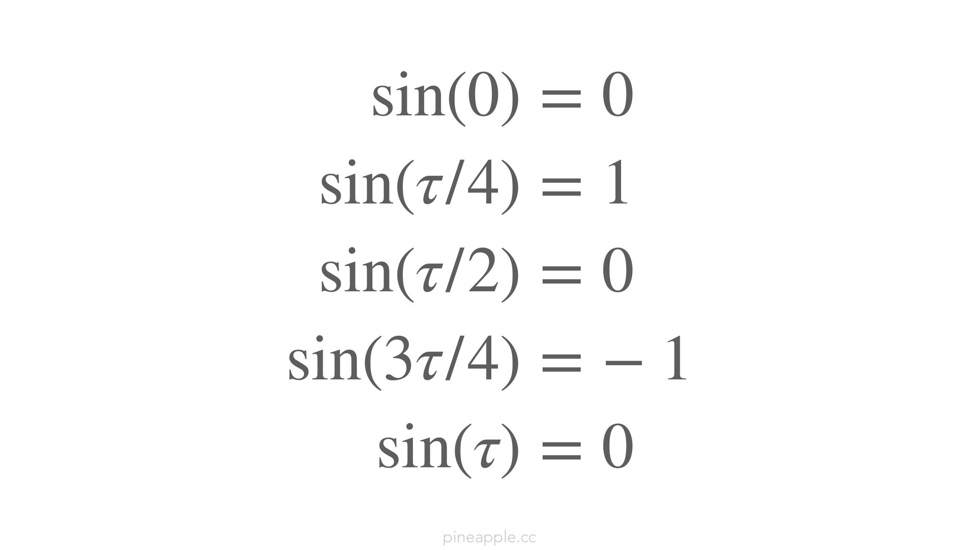 pineapple.cc sin(0) = 0 sin(τ/4) = 1 sin(τ/2) = 0