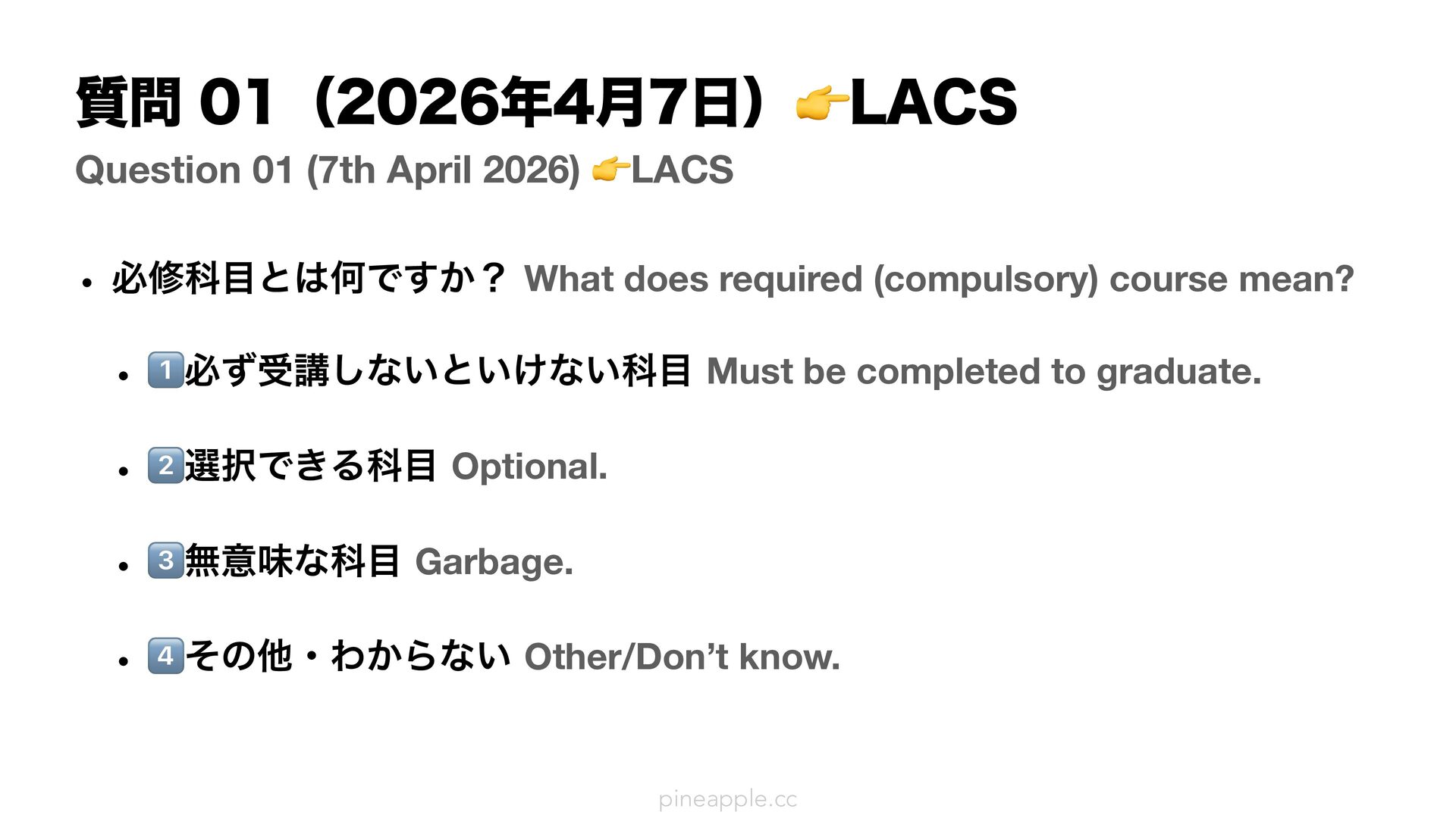 pineapple.cc ࣭ʢ݄ʣ👉-"$4 Question 01 (7th April 2026) 👉LACS w ඞमՊͱԿͰ͔͢ʁWhat