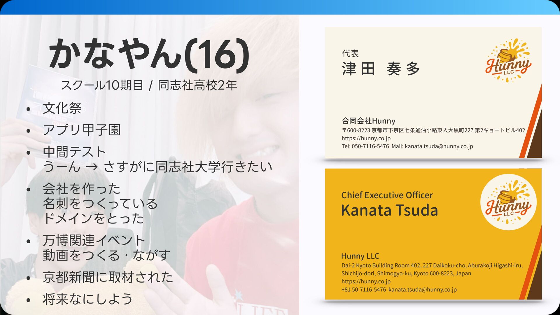 → さすがに同志社 大 学 行 きたい • 会社を作った 名刺をつくっている ドメインをとった • 万博関連イベント 動画をつくる・ながす • 京都新聞に取材された • 将来なにしよう かなやん(16) スクール10期 目 / 同志社 高 校2年