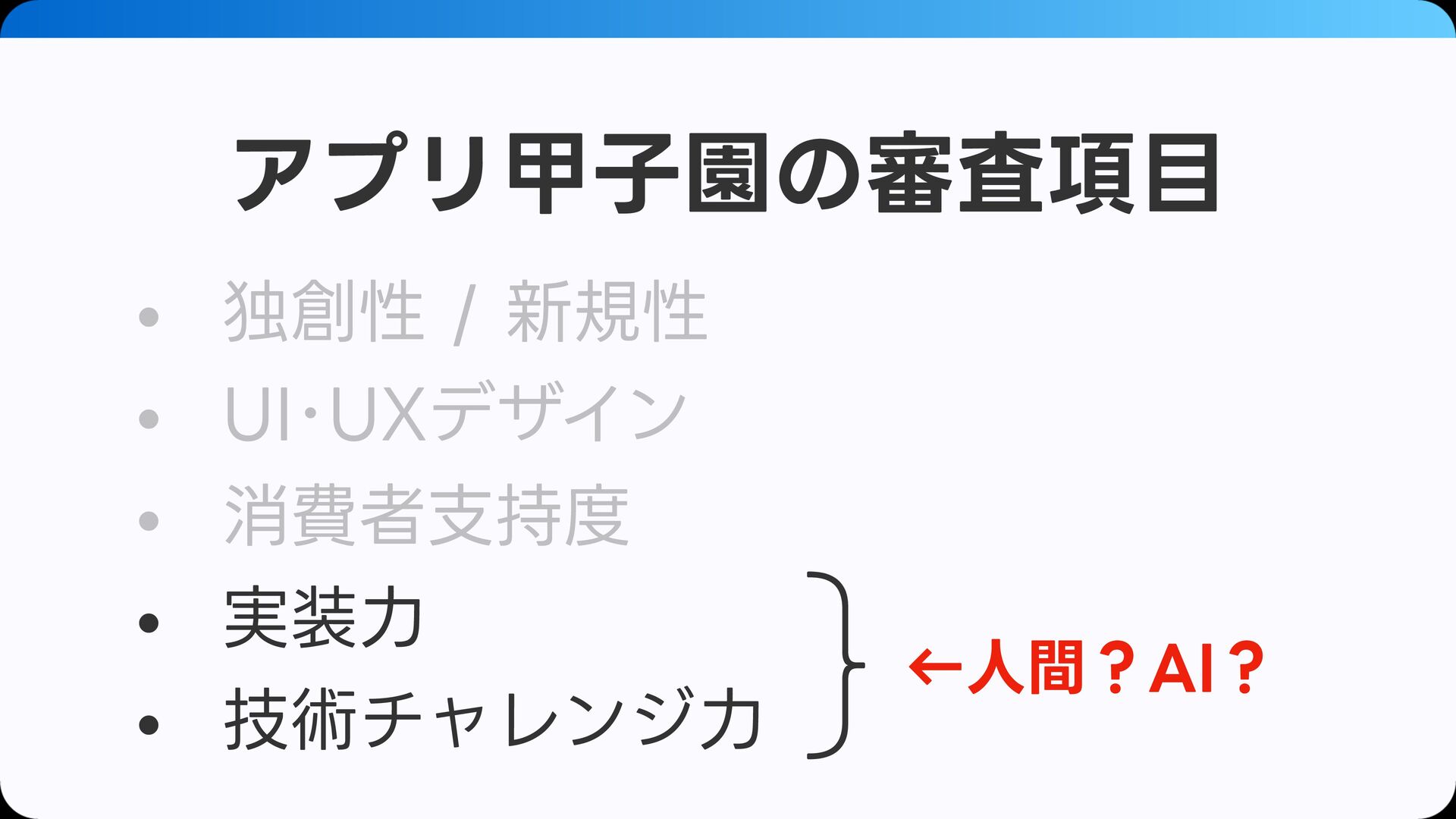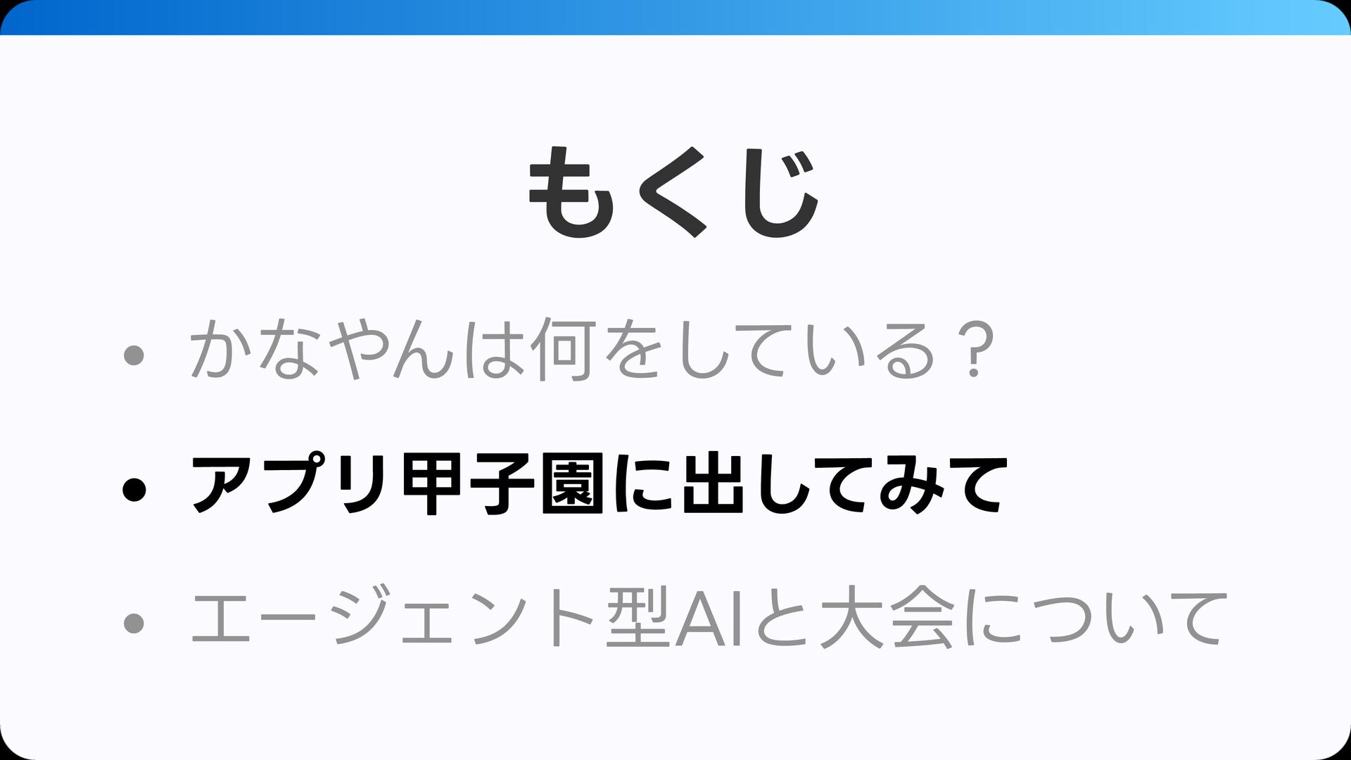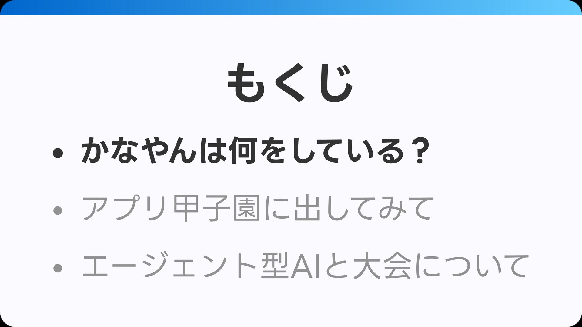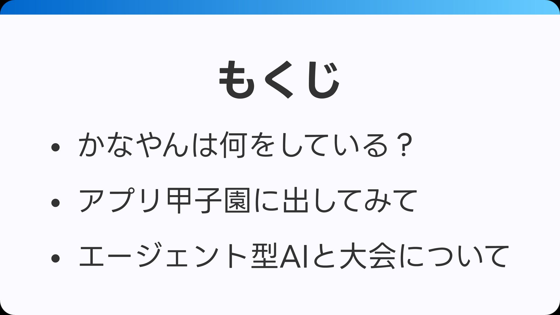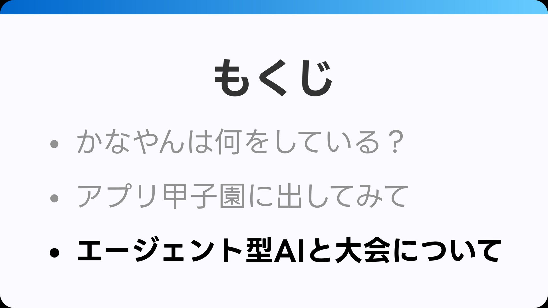 • かなやんは何をしている? • アプリ甲 子 園に出してみて • エージェント型AIと 大 会について