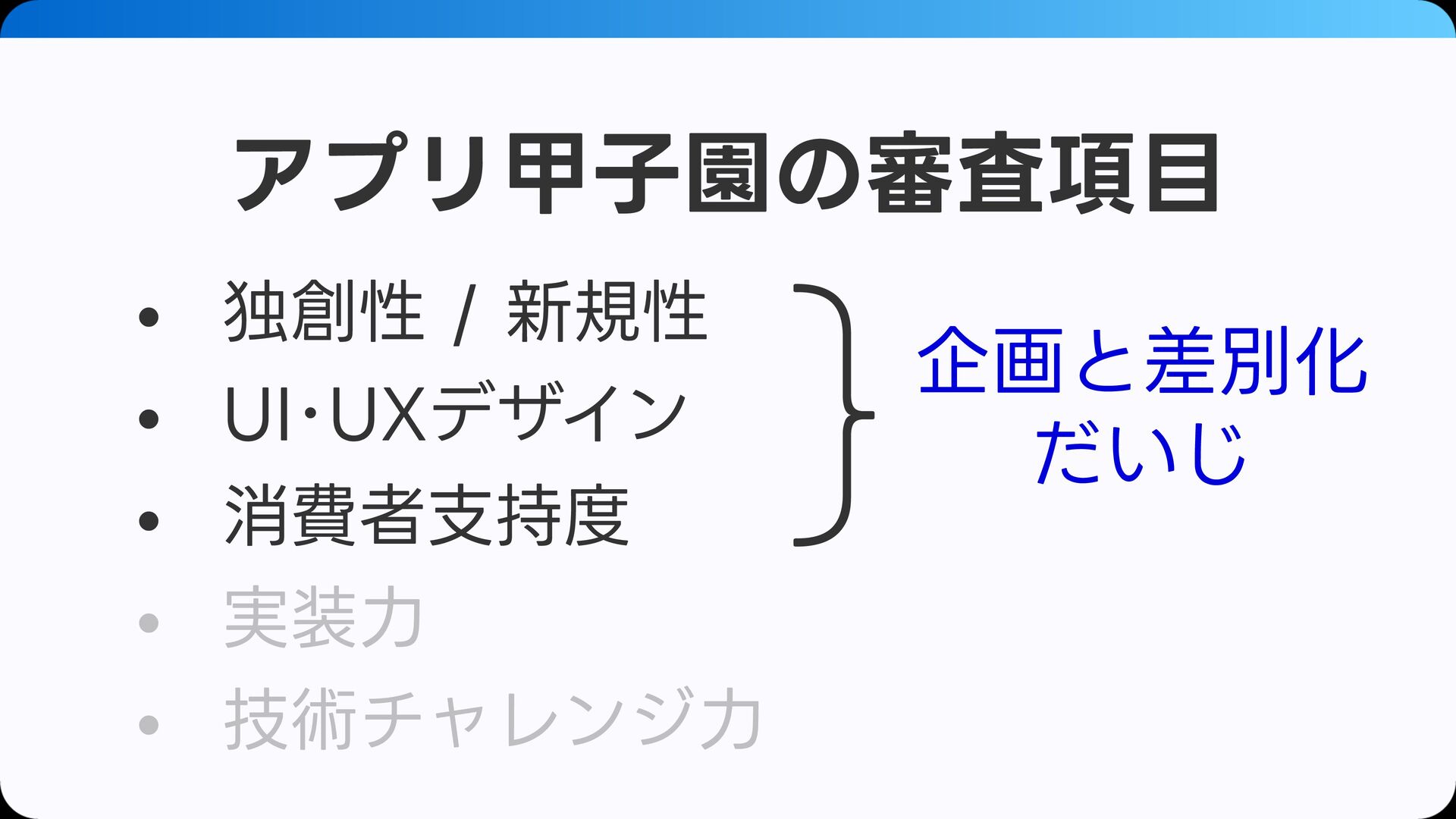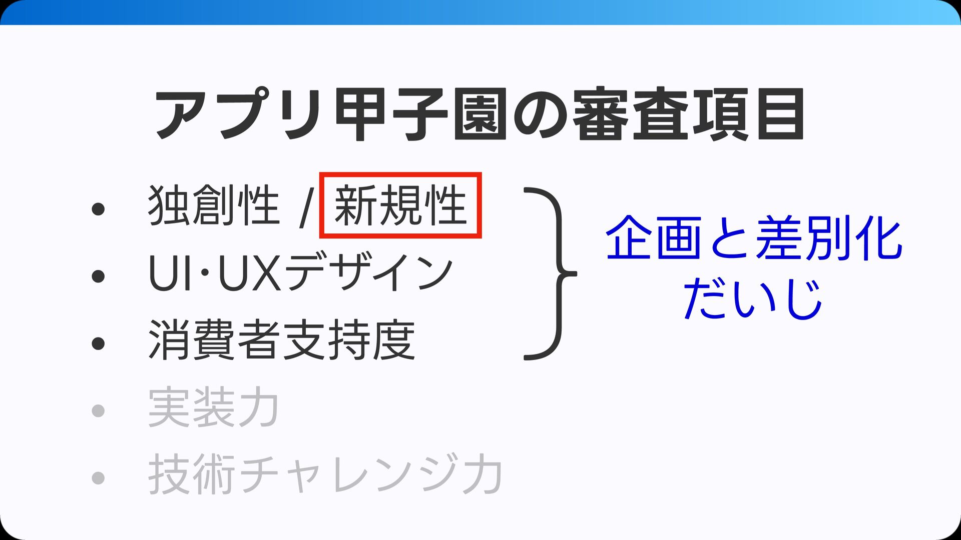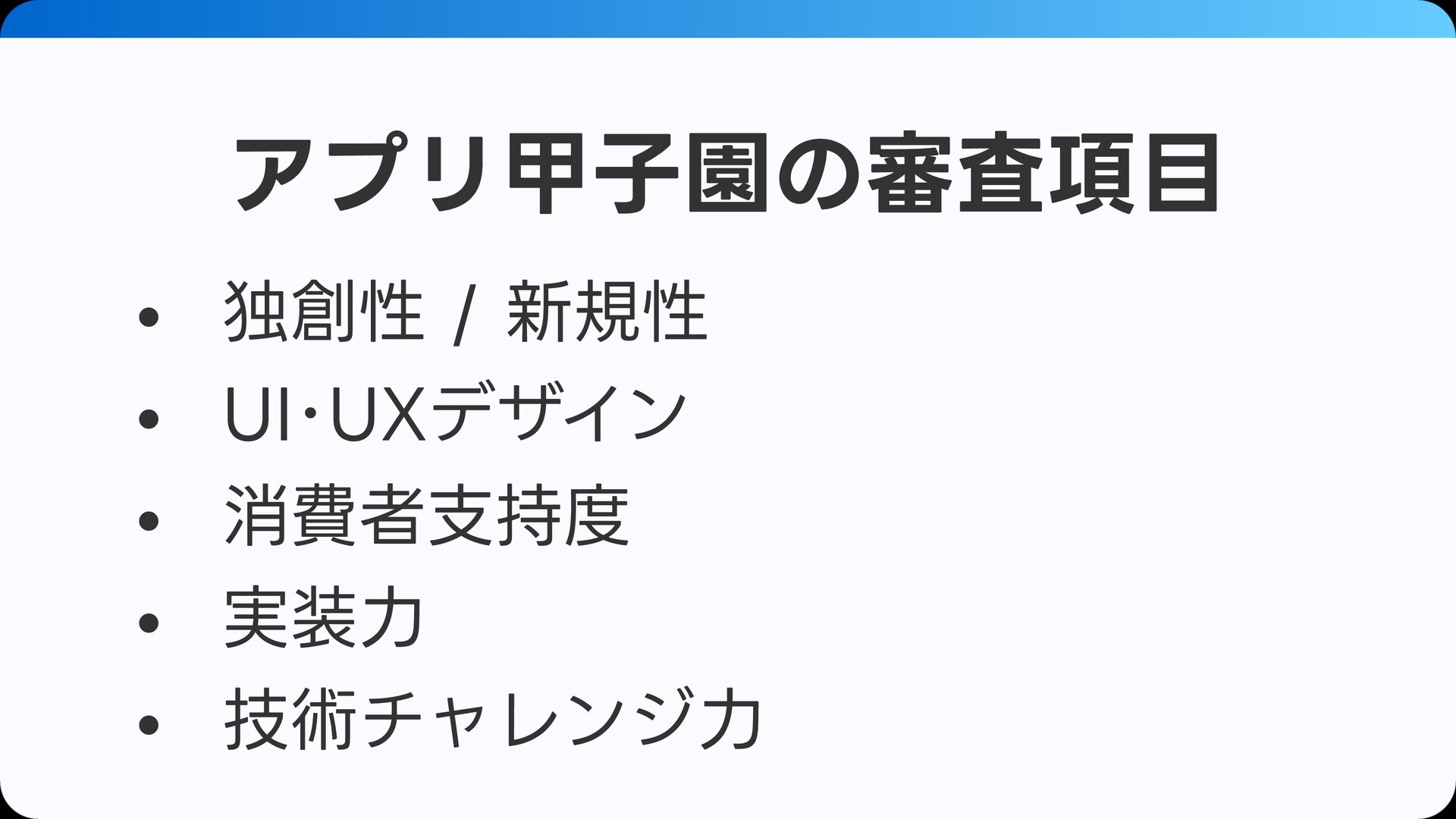 アプリ甲 子 園の審査項 目 • 独創性 / 新規性 • UI・UXデザイン
