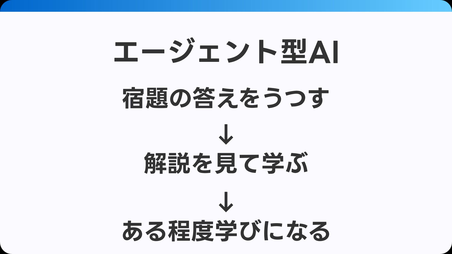 エージェント型AI 宿題の答えをうつす ↓ 解説を 見 て学ぶ ↓ ある程度学びになる
