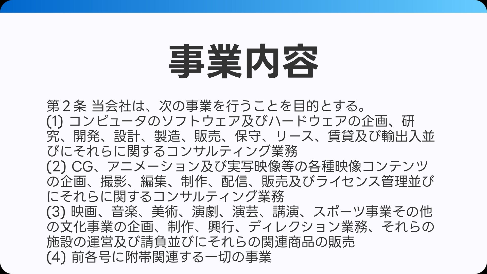 並 びにそれらに関するコンサルティング業務 (2) CG、アニメーション及び実写映像等の各種映像コンテンツ の企画、撮影、編集、制作、配信、販売及びライセンス管理並び にそれらに関するコンサルティング業務 (3) 映画、 音 楽、美術、演劇、演芸、講演、スポーツ事業その他 の 文 化事業の企画、制作、興 行 、ディレクション業務、それらの 施設の運営及び請負並びにそれらの関連商品の販売 (4) 前各号に附帯関連する 一 切の事業 事業内容