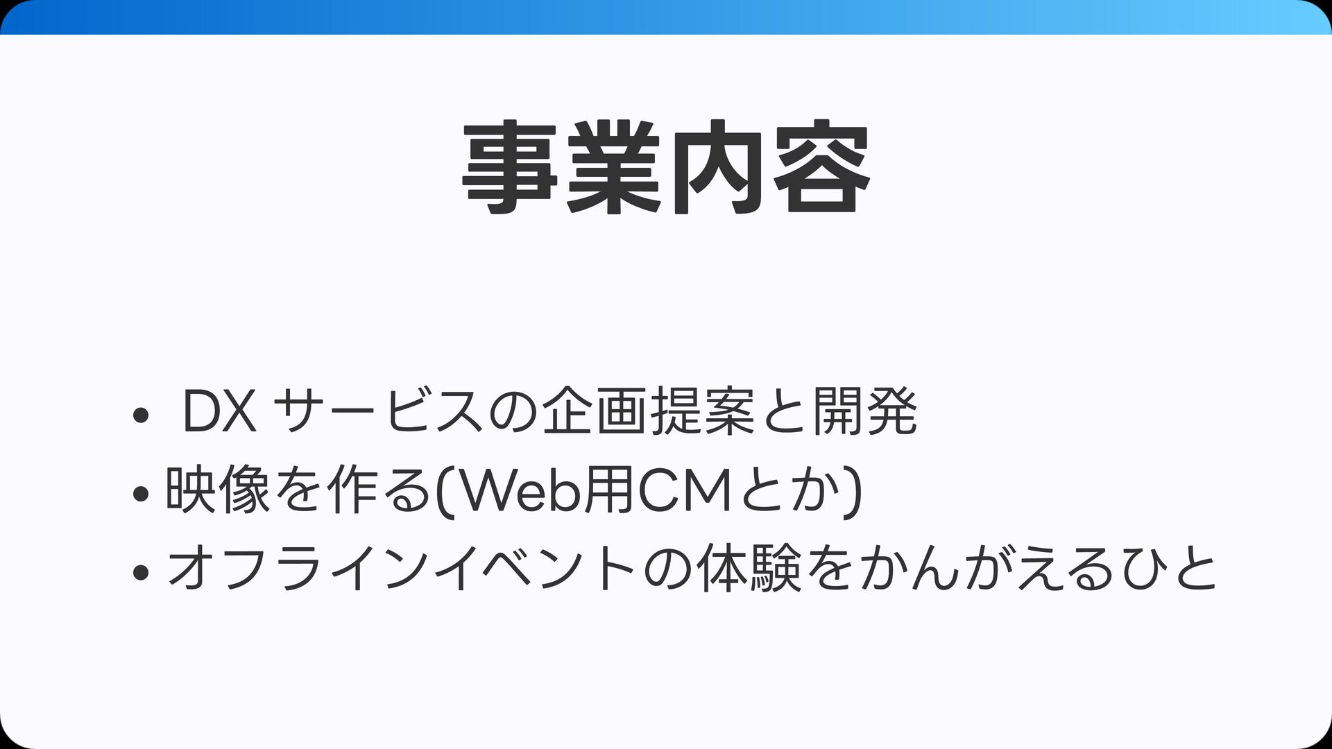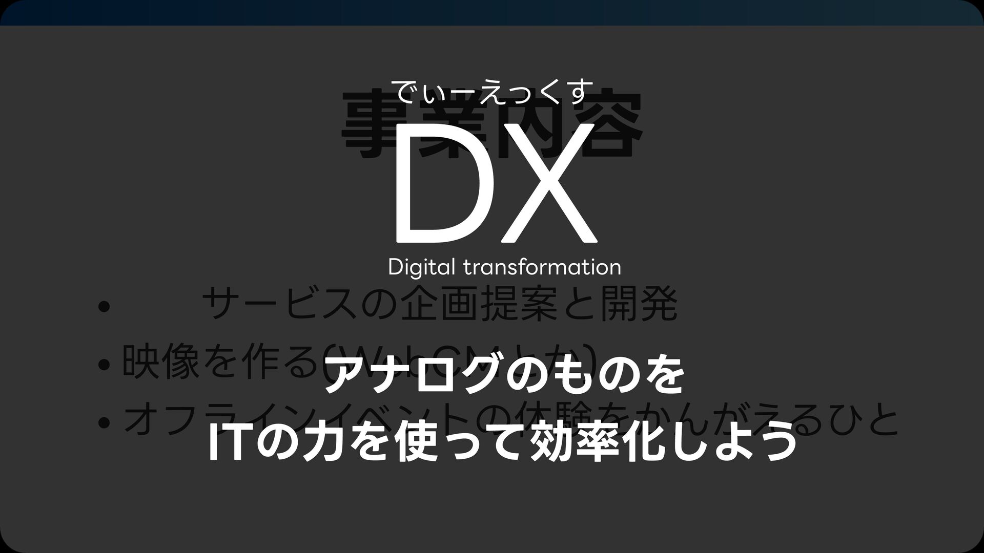 • サービスの企画提案と開発 •映像を作る(WebCMとか) •オフラインイベントの体験をかんがえるひと 事業内容 DX でぃーえっくす アナログのものを ITの