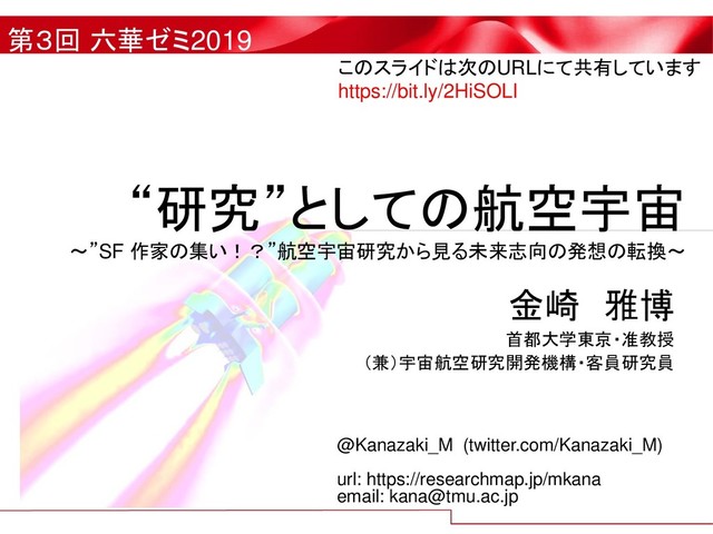 2019年8月23日,六華ゼミで担当した際のスライド.(一部・全部にかかわらず,転載,2次配布禁止 ) タイトル:“研究”としての航空宇宙~”SF 作家の集い!?”航空宇宙研究から見る未来志向の発想の転換~ 講師:金崎雅博 https://sapporominami44.amebaownd.com/posts/categories/1816107