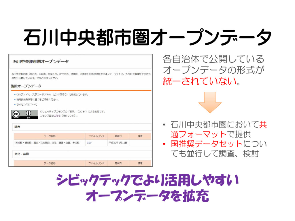 石川中央都市圏オープンデータ 各自治体で公開している オープンデータの形式が 統一されていない。 シビックテックでより活用しやすい オープンデータを拡充 • 石川中央都市圏において共 通フォーマットで提供 •
