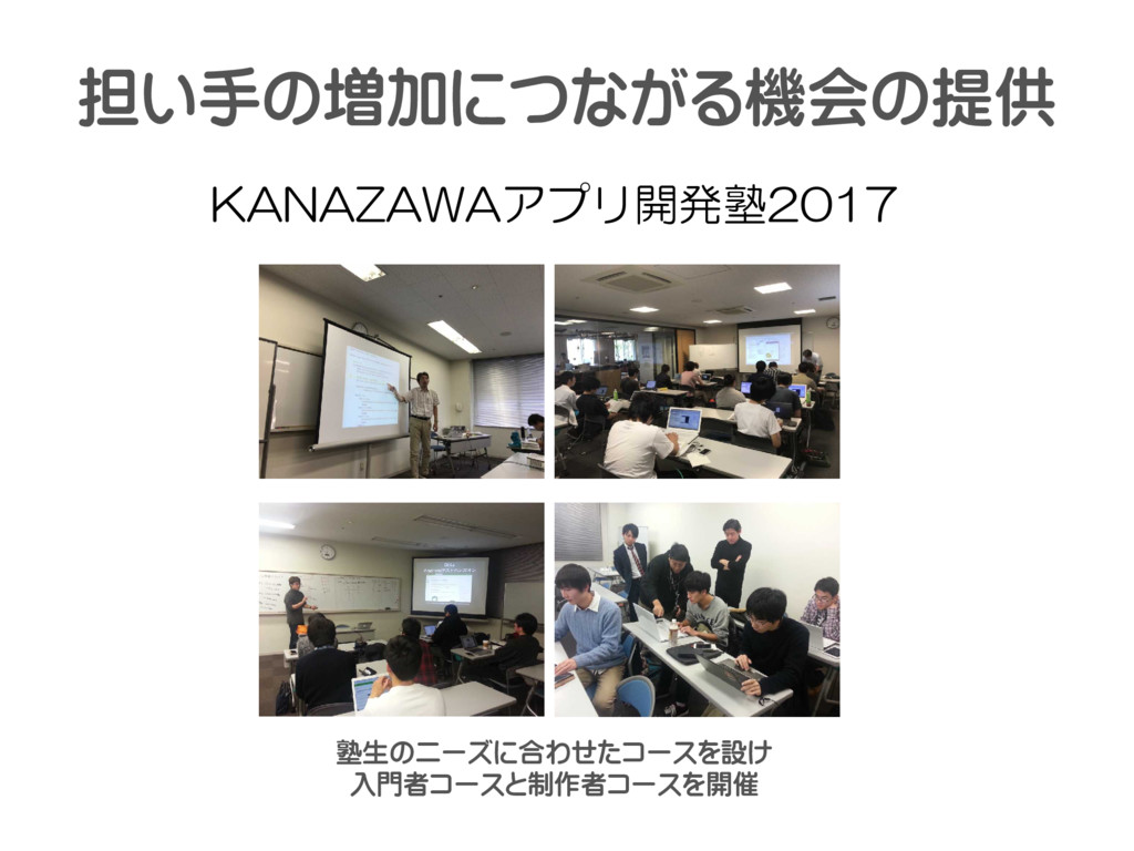 KANAZAWAアプリ開発塾2017 塾生のニーズに合わせたコースを設け 入門者コースと制作者コースを開催 担い手の増加につながる機会の提供