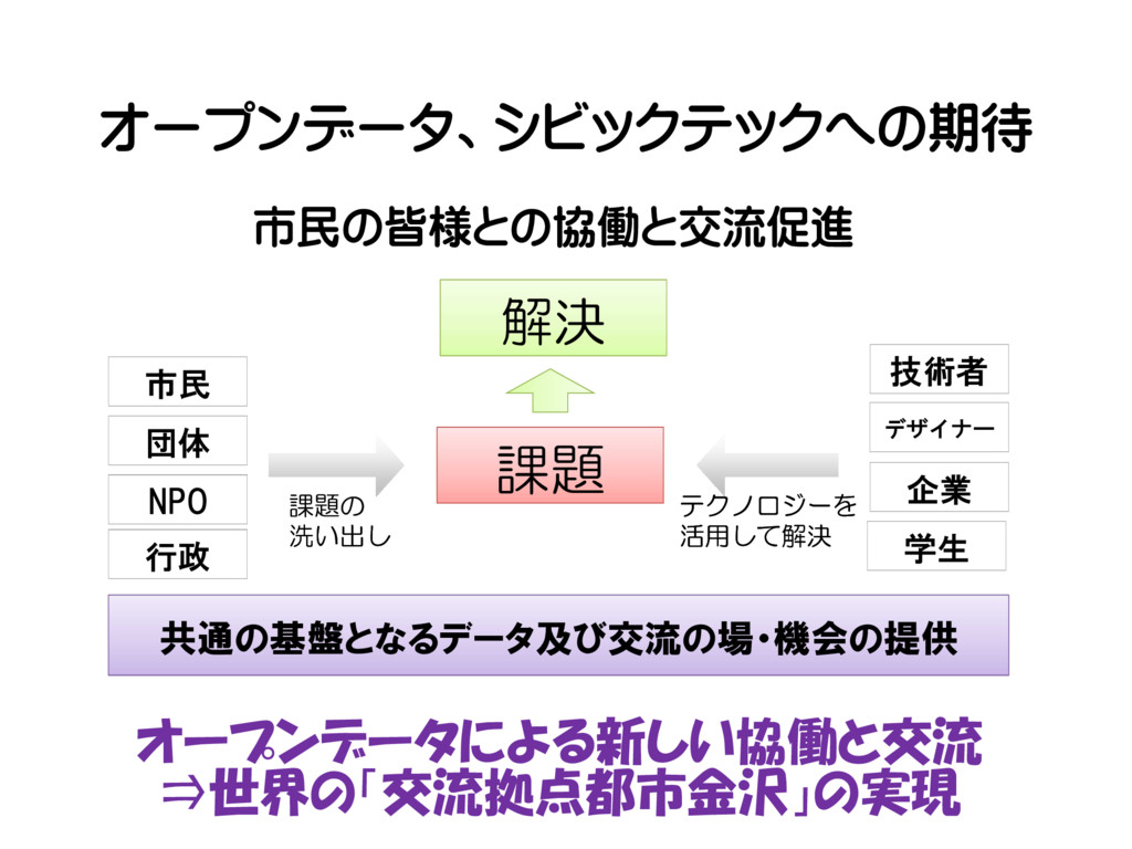 洗い出し 課題の 洗い出し テクノロジーを 活用して解決 テクノロジーを 活用して解決 行政 学生 共通の基盤となるデータ及び交流の場・機会の提供 オープンデータによる新しい協働と交流 ⇒世界の「交流拠点都市金沢」の実現 市民の皆様との協働と交流促進