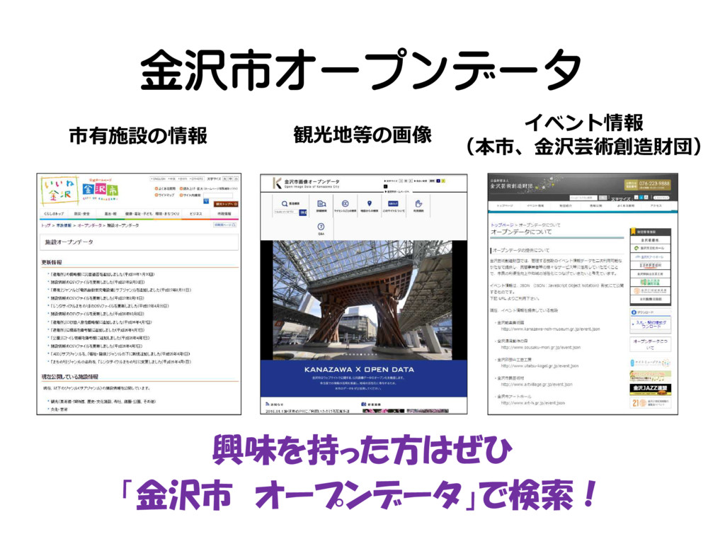 金沢市オープンデータ 市有施設の情報 観光地等の画像 イベント情報 (本市、金沢芸術創造財団) 興味を持った方はぜひ 「金沢市 オープンデータ」で検索!