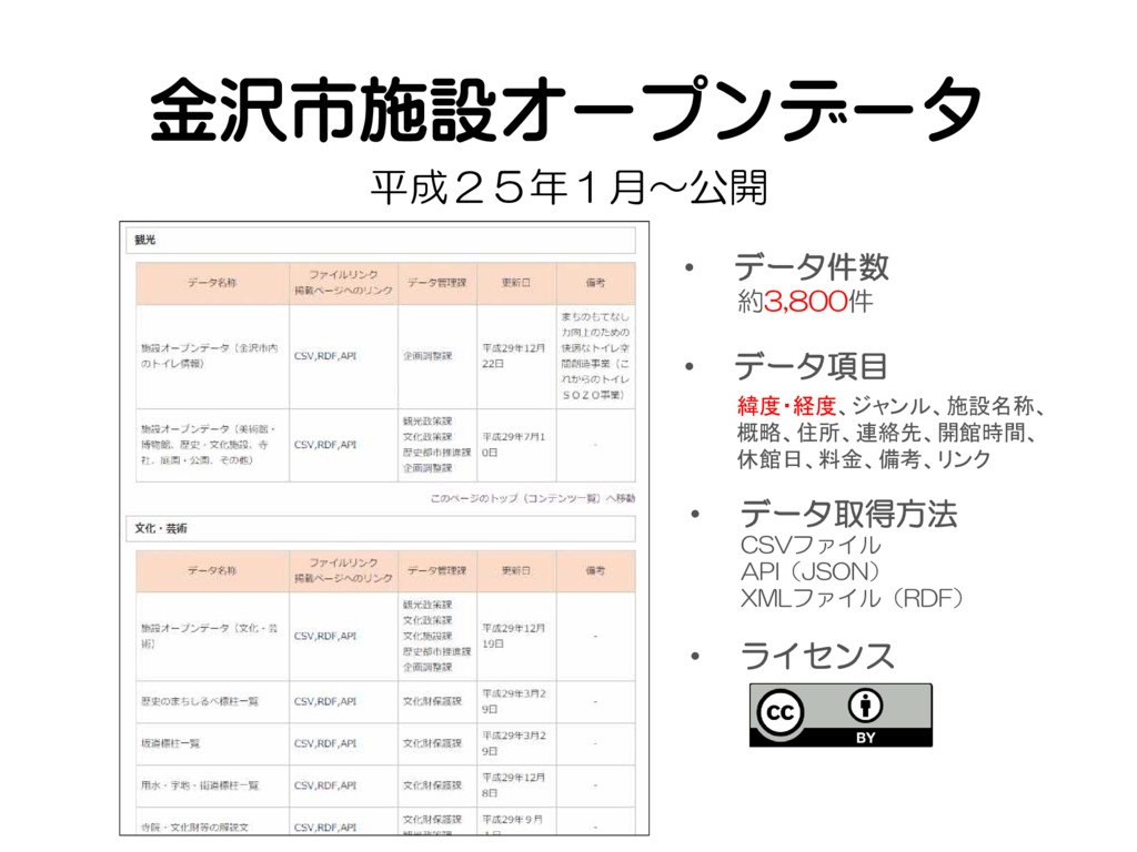 金沢市施設オープンデータ 平成25年1月〜公開 • データ件数 約3,800件 • データ取得方法 CSVファイル API(JSON) XMLファイル(RDF)