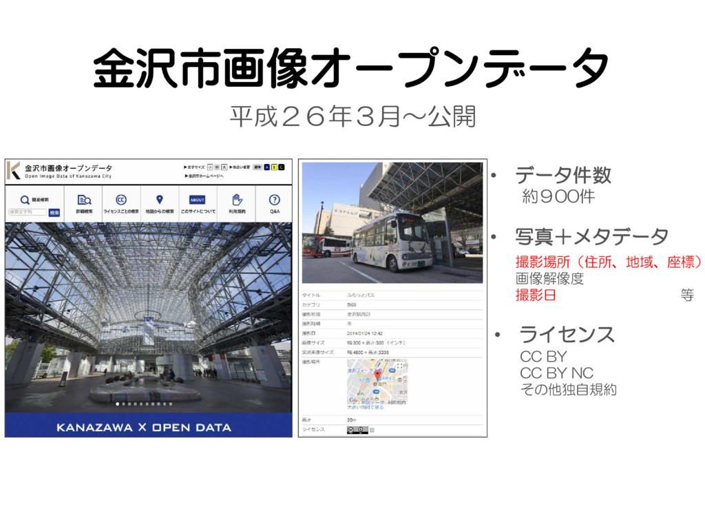 金沢市画像オープンデータ 平成26年3月〜公開 • データ件数 約900件 撮影場所(住所、地域、座標) 画像解像度 撮影日 等 •