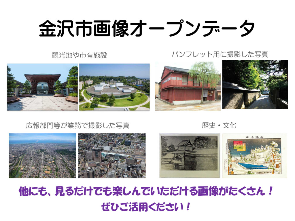 金沢市画像オープンデータ 観光地や市有施設 パンフレット用に撮影した写真 広報部門等が業務で撮影した写真 歴史・文化 他にも、見るだけでも楽しんでいただける画像がたくさん! ぜひご活用ください!