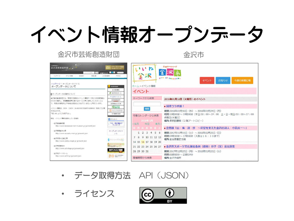 金沢市芸術創造財団 金沢市 • データ取得方法 API(JSON) • ライセンス イベント情報オープンデータ