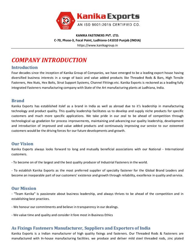 and exporter of Threaded Rods, Threaded Bars, Sag Rods, Coil Rods, Tie Rods, Hex Nuts, Hex Bolts Fasteners, Strut Support Systems, Strut Channels etc and exporting to India, Indonesia, Pakistan, Bangladesh, Japan, Philippines, Vietnam, Iran, Turkey, Thailand, Myanmar, South Korea, Iraq, Malaysia, Uzbekistan, Saudi Arabia, Nepal, Afghanistan, North Korea, Yemen, Taiwan, Syria, Sri Lanka, Cambodia, Azerbaijan, United Arab Emirates, Israel, Tajikistan, Hong Kong, Laos, Jordan, Singapore, Georgia, Lebanon, Oman, Kuwait, Armenia, Mongolia, Qatar, Bahrain, Cyprus, Bhutan, Brunei, Maldives. Threaded Rods & Bars European Countries :- We are the manufacturer and exporter of Threaded Rods, Threaded Bars, Sag Rods, Coil Rods, Tie Rods, Hex Nuts, Hex Bolts Fasteners, Strut Support Systems, Strut Channels etc and exporting to Russia, Germany, United Kingdom, France, Italy, Spain, Ukraine, Poland, Romania, Netherlands, Belgium, Greece, Portugal, Czech Republic, Hungary, Sweden, Belarus, Austria, Switzerland, Bulgaria, Serbia, Denmark, Finland, Slovakia, Norway, Ireland Threaded Rods & Bars African Countries : - We are the manufacturer and exporter of Threaded Rods, Threaded Bars, Sag Rods, Coil Rods, Tie Rods, Hex Nuts, Hex Bolts Fasteners, Strut Support Systems, Strut Channels etc and exporting to South Africa, Egypt, Nigeria, Algeria, Morocco, Angola, Tunisia, Ethiopia, Sudan, Ghana, Kenya, Tanzania, Cameroon, Uganda, Libya, Botswana, Senegal, Gabon, Zambia, Madagascar, Chad, Mauritius, Mali, Namibia, Benin, Malawi, Rwanda, Niger, Guinea, Mauritania, Togo, Swaziland, Zimbabwe, Burundi, Eritrea, Cape Verde, Liberia, Comoros Threaded Rods & Bars South America : - We are the manufacturer and exporter of Threaded Rods, Threaded Bars, Sag Rods, Coil Rods, Tie Rods, Hex Nuts, Hex Bolts Fasteners, Strut Support Systems, Strut Channels etc and exporting to Brazil, Colombia, Argentina, Peru, Venezuela, Chile, Ecuador, Bolivia Threaded Rods & Bars Middle East : We are the manufacturer and exporter of Threaded Rods, Threaded Bars, Sag Rods, Coil Rods, Tie Rods, Hex Nuts, Hex Bolts Fasteners, Strut Support Systems, Strut Channels etc and exporting to Egypt, Iran, Turkey, Iraq, Saudi Arabia, Yemen, Syria, United Arab Emirates, Israel, Jordan, Lebanon, Oman, Kuwait, Qatar, Bahrain, Cyprus KANIKA EXPORTS is Indian manufacturers & exporters of all types of Threaded Rods, Thread Bars & Studs. KANIKA EXPORTS established in 2009 at Ludhiana Punjab and engaged in the manufacturing & export business of International Standard Quality threaded rods, threaded bars, Coil Rods / Tie Rods, Spring Channel Nuts, Channel Brackets, Pipe Clamps, Strut Channel Fittings & Accessories etc. in Punjab, Ludhiana, Amritsar, Jalandhar, Patiala, Bathinda, Ajitgarh, Hoshiarpur, Batala, Pathankot, Moga, Abohar, Khanna, Phagwwara, Muktsar, Barnala, Rajpura, Firozpur, Kapurthala, mandi gobindgarh, fatehgarh sahib, samrala, jagraon, mansa, sirhind, chandigarh, Mohali, panchkula, kharar, Punjab, Delhi, Haryana, Gurgaon, Utter Pradesh, Bihar, India, Canada, USA, Australia, UK, New Zealand, France, Norway, France, Nepal. manufacturers exporters in India https://www.kanikagroup.in +91-9872100027