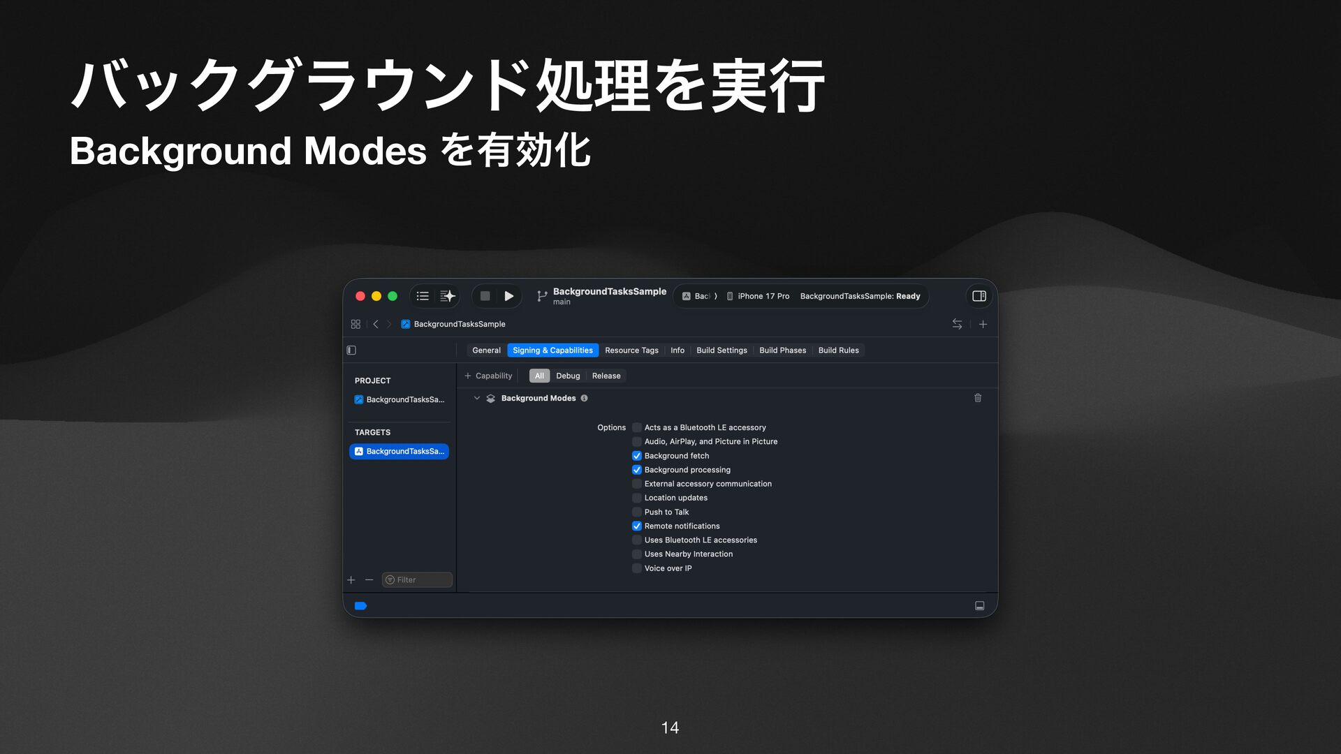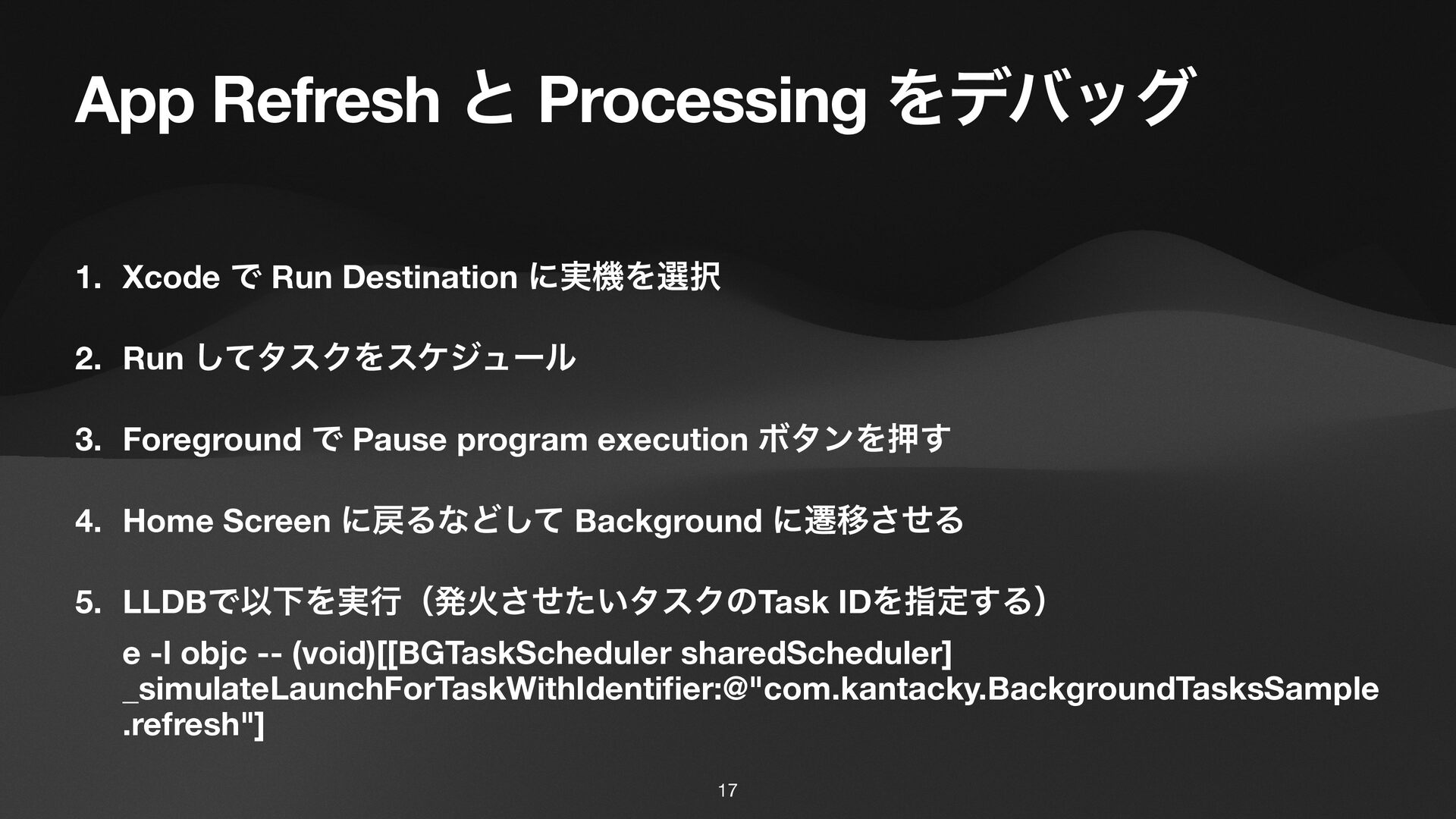 e -l objc -- (void)[[BGTaskScheduler sharedScheduler] _simulateLaunchForTaskWithIdenti fi er:@"com.kantacky.BackgroundTasksSample .refresh"] 17
