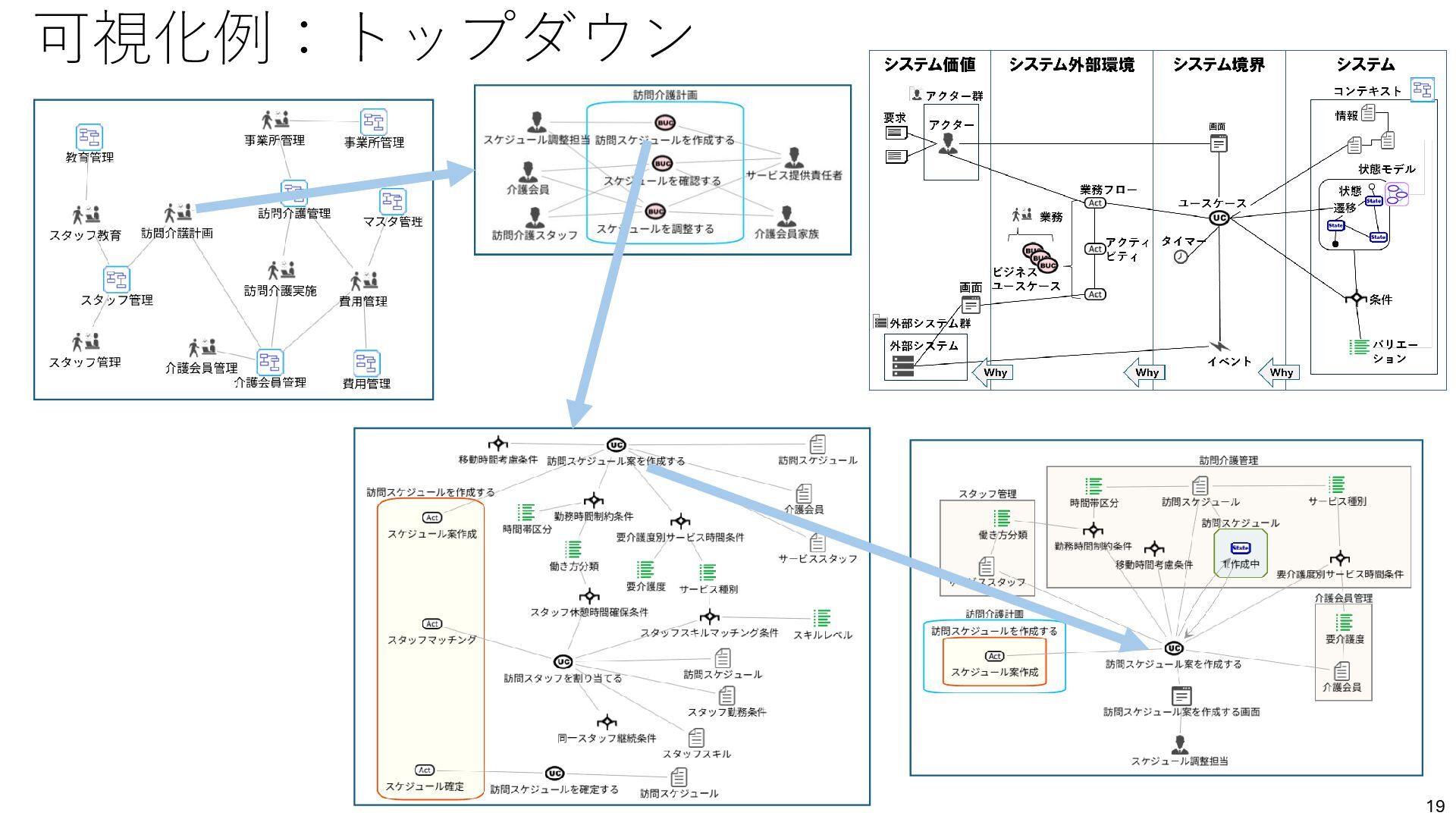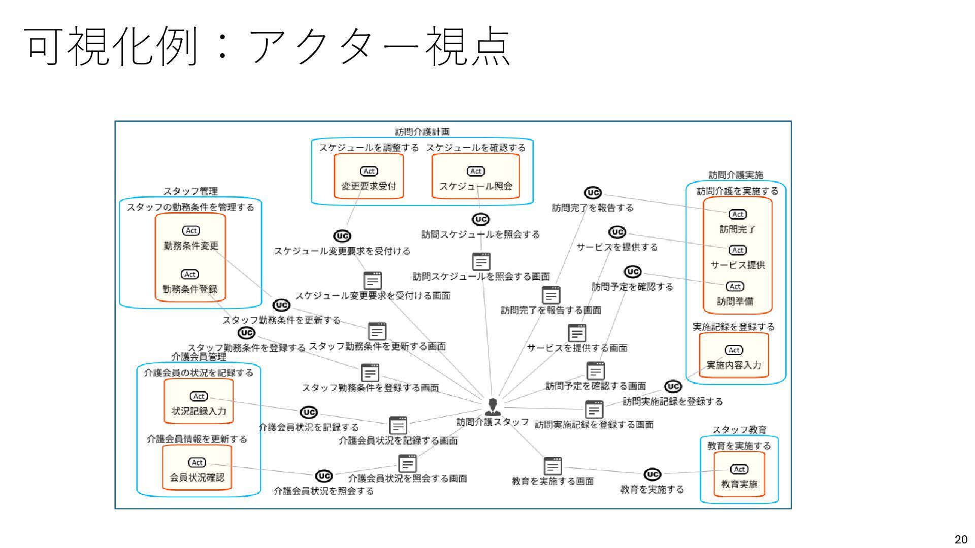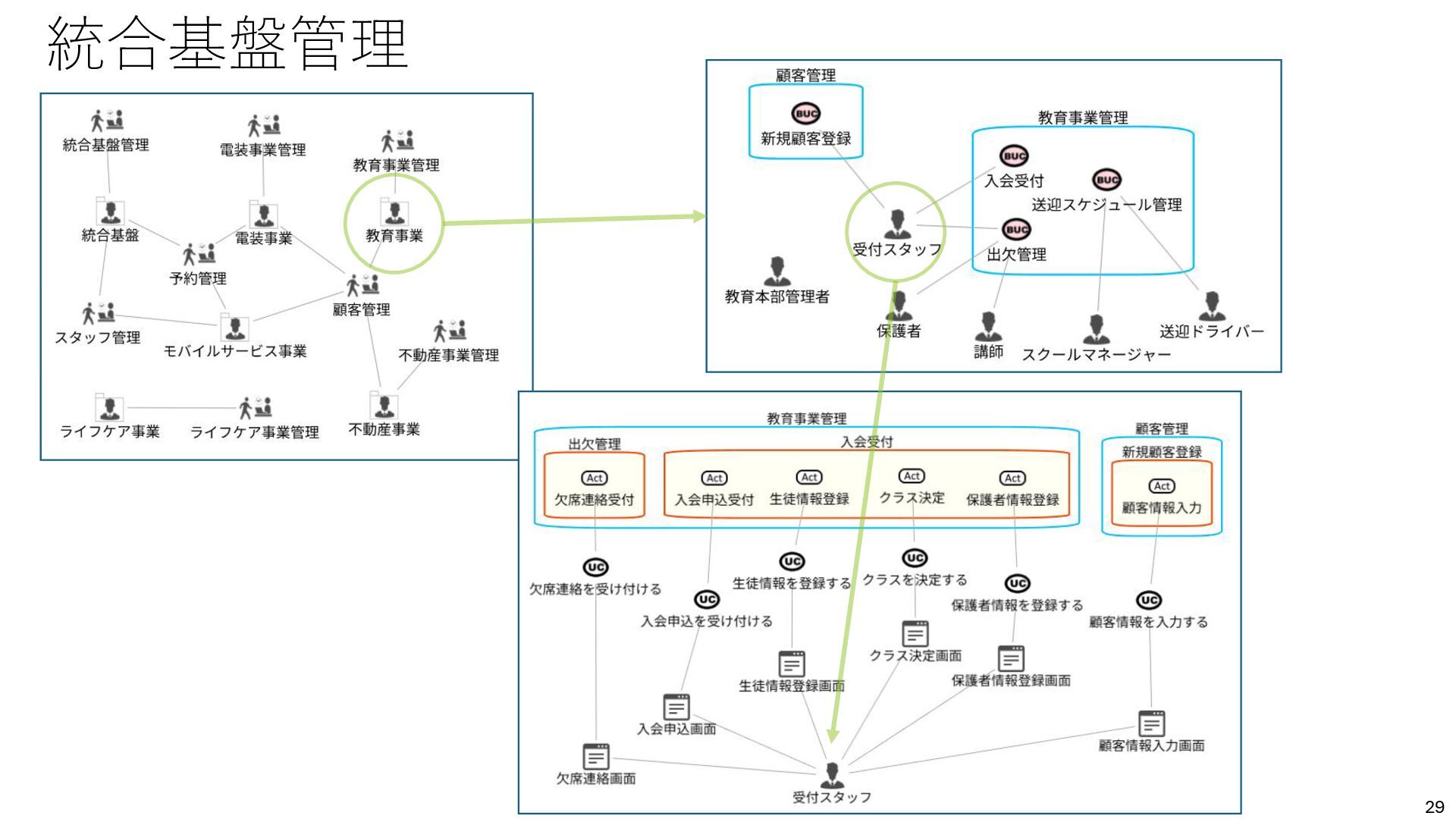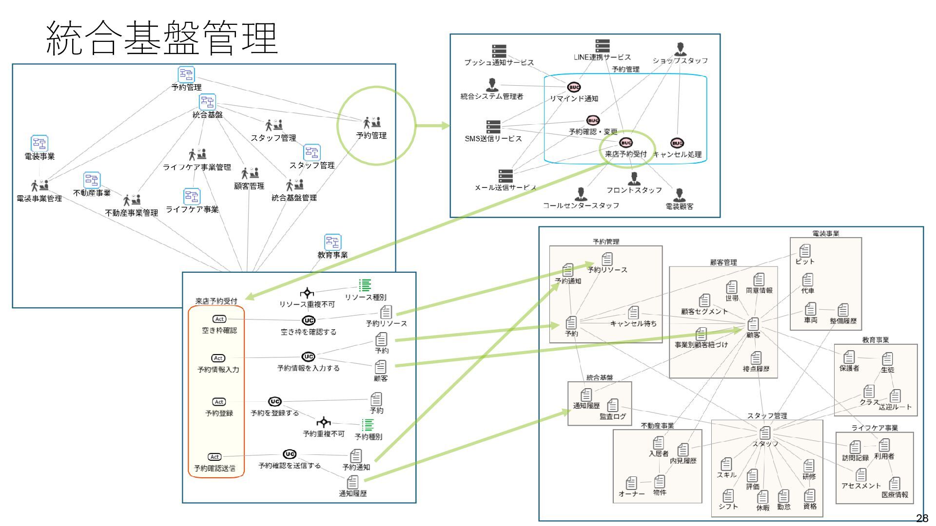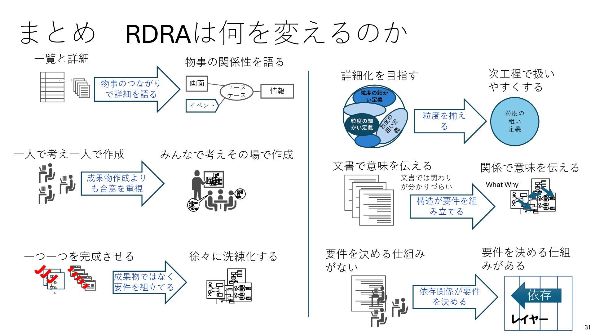 画面 情報 イベント 物事の関係性を語る 一人で考え一人で作成 一つ一つを完成させる 徐々に洗練化する 成果物ではなく 要件を組立てる 構造が要件を組 み立てる 文書で意味を伝える 関係で意味を伝える みんなで考えその場で作成 What Why 文書では関わり が分かりづらい 粒度の細か い定義 粒度の細 かい定義 粒度の 粗い 定義 Xx x Xx x Xx x Xx x Xx x Xx x 詳細化を目指す 次工程で扱い やすくする 要件を決める仕組み がない 要件を決める仕組 みがある 依存 レイヤー 依存関係が要件 を決める 粒度を揃え る