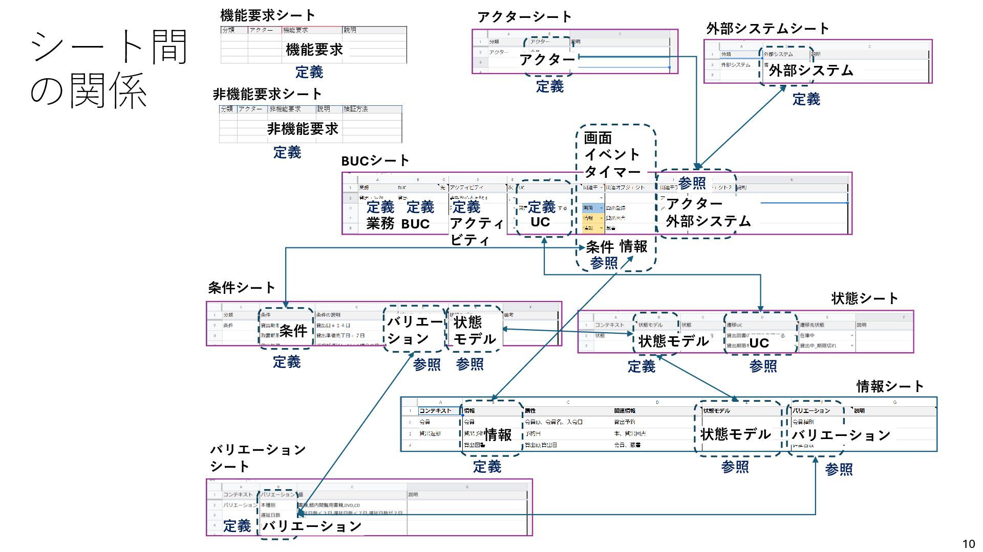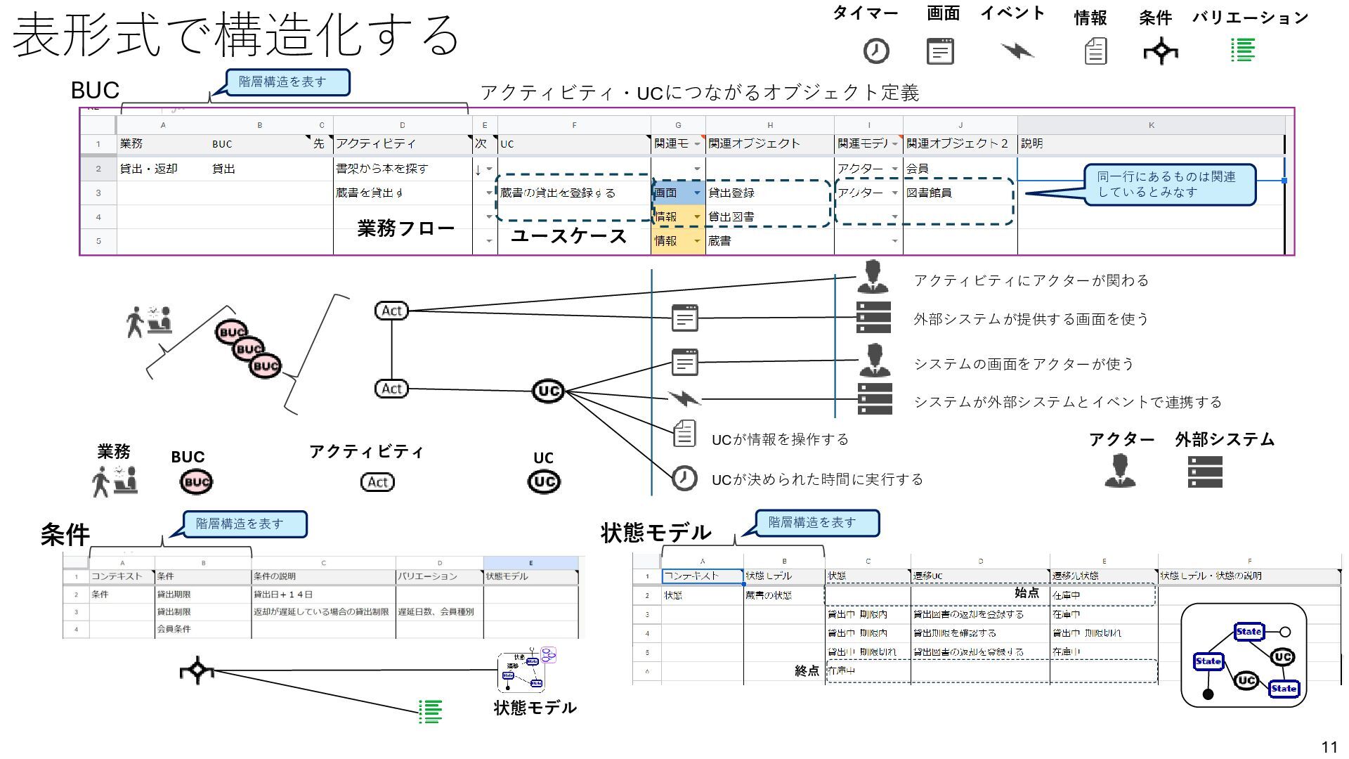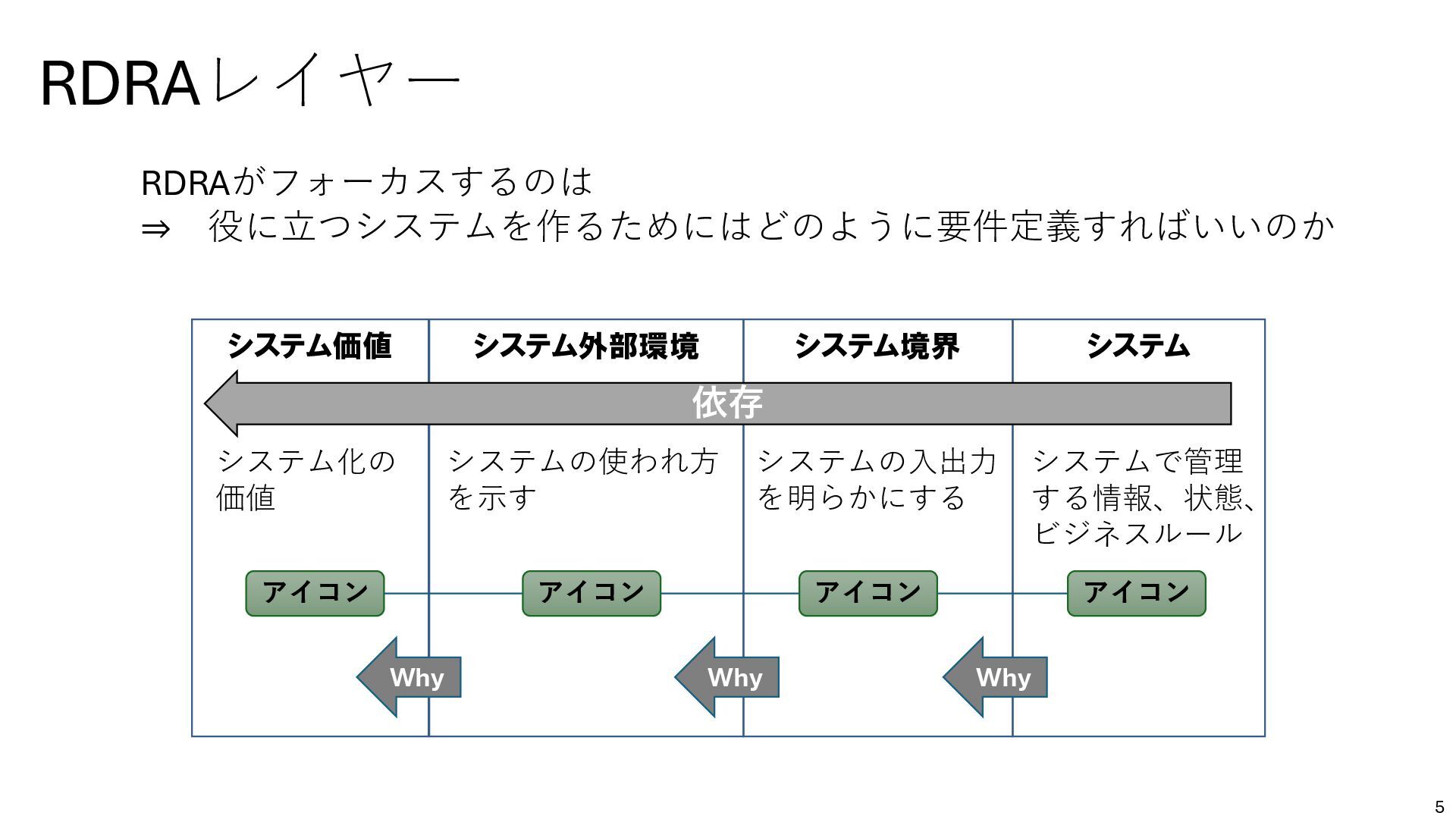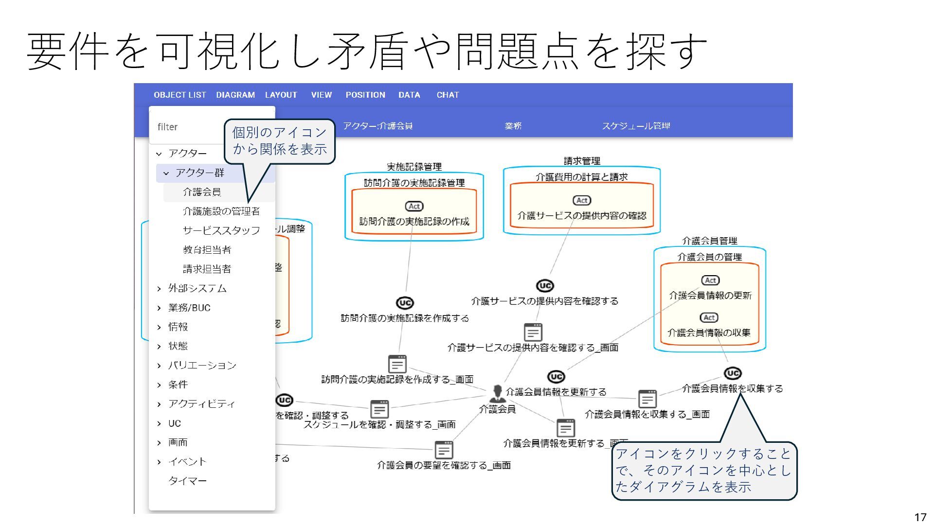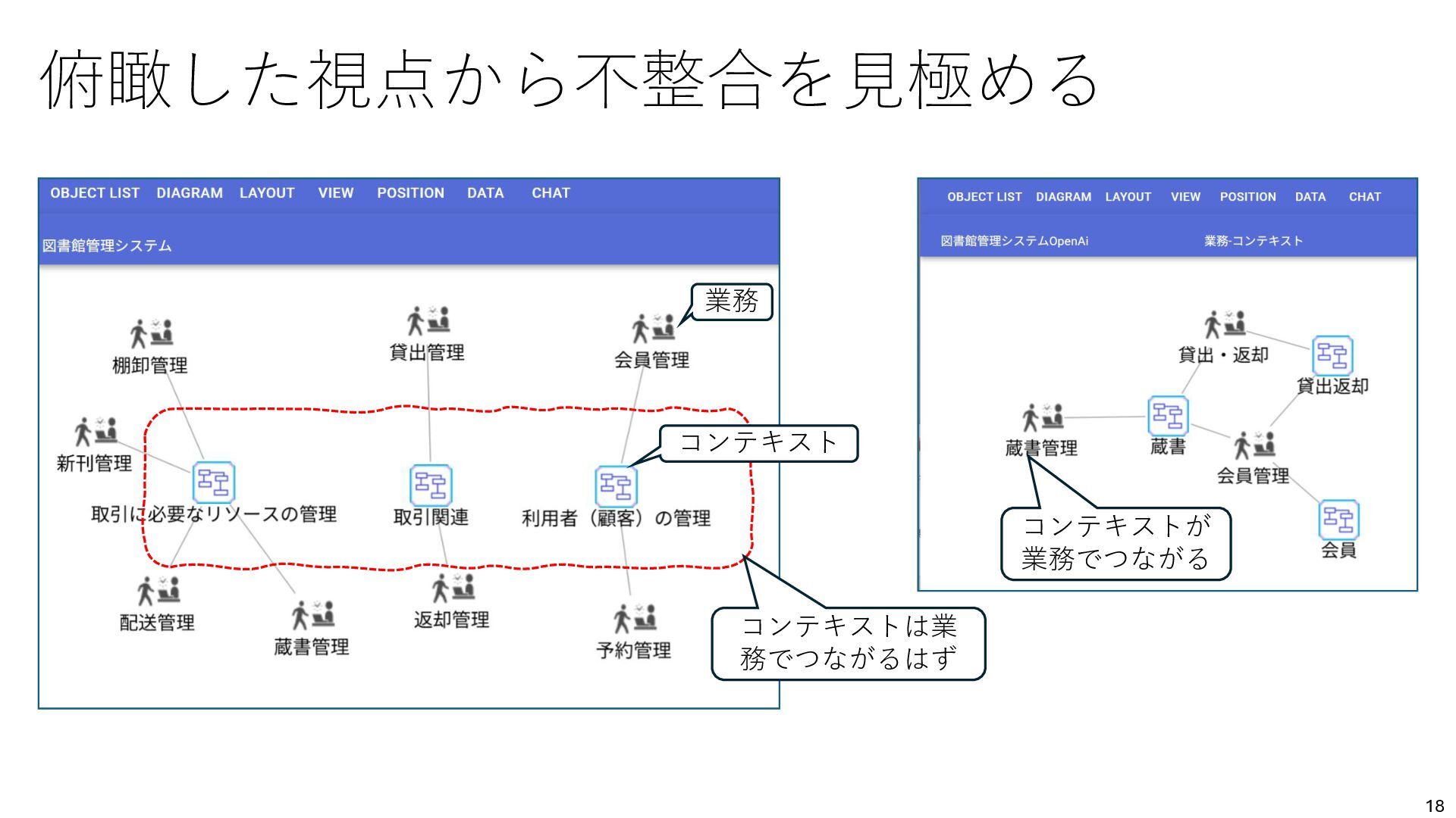 画面 情報 イベント 物事の関係性を語る 一人で考え一人で作成 一つ一つを完成させる 徐々に洗練化する 成果物ではなく 要件を組立てる 構造が要件を組 み立てる 文書で意味を伝える 関係で意味を伝える みんなで考えその場で作成 What Why 文書では関わり が分かりづらい 粒度の細か い定義 粒度の細 かい定義 粒度の 粗い 定義 Xx x Xx x Xx x Xx x Xx x Xx x 詳細化を目指す 次工程で扱い やすくする 要件を決める仕組み がない 要件を決める仕組 みがある 依存 レイヤー 依存関係が要件 を決める 粒度を揃え る