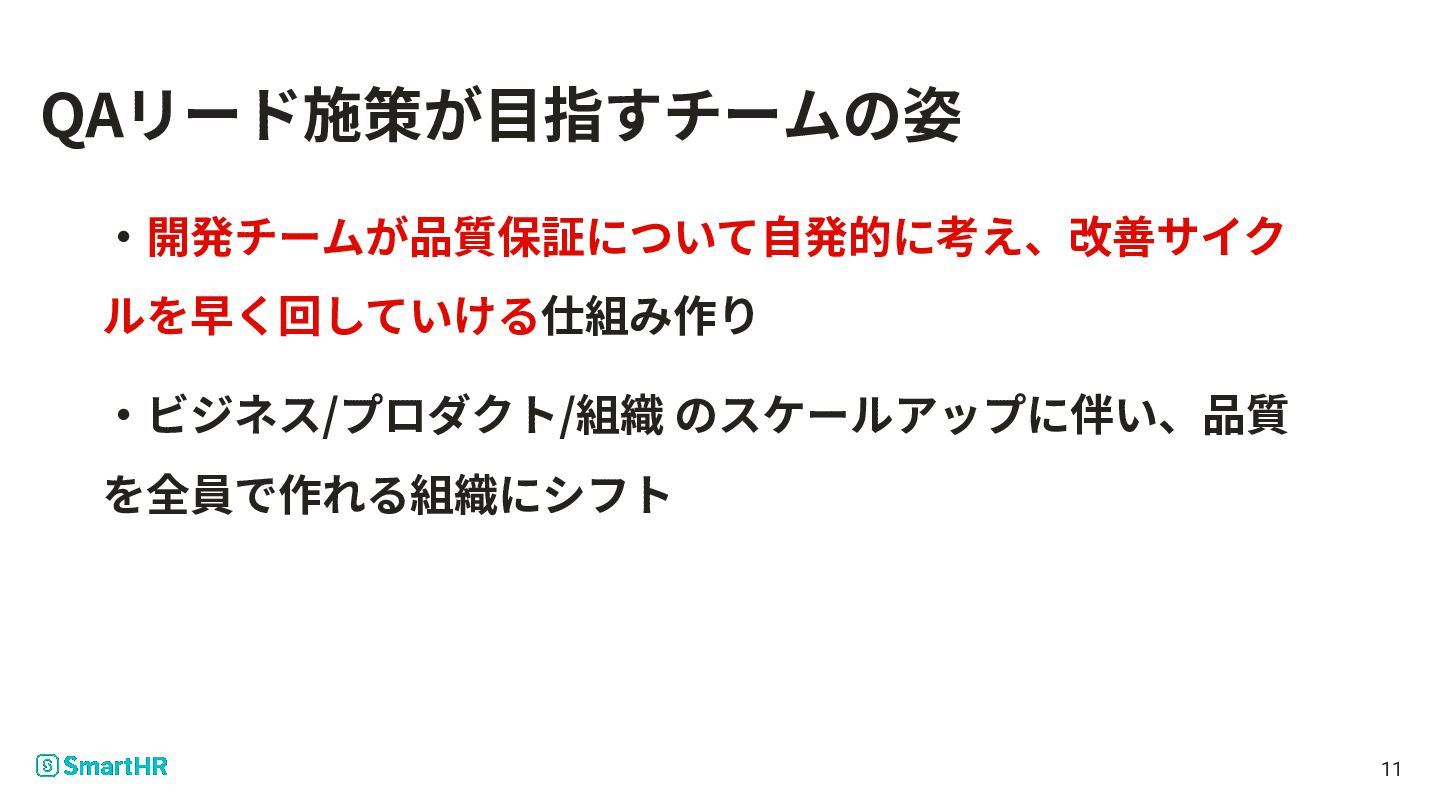 QAリード施策が⽣まれた背景 10 開発チームの課題 • 2024年末〜2025年始にメンバーの異動などが重なり⼀時的にチーム専属のQAEが 不在に ◦ 品質保証関連業務に対する不安の声が開発チームメンバーからあがる → (期間限定で)インプロセスQAとして開発チームに⼊り、品質保証体制を整え