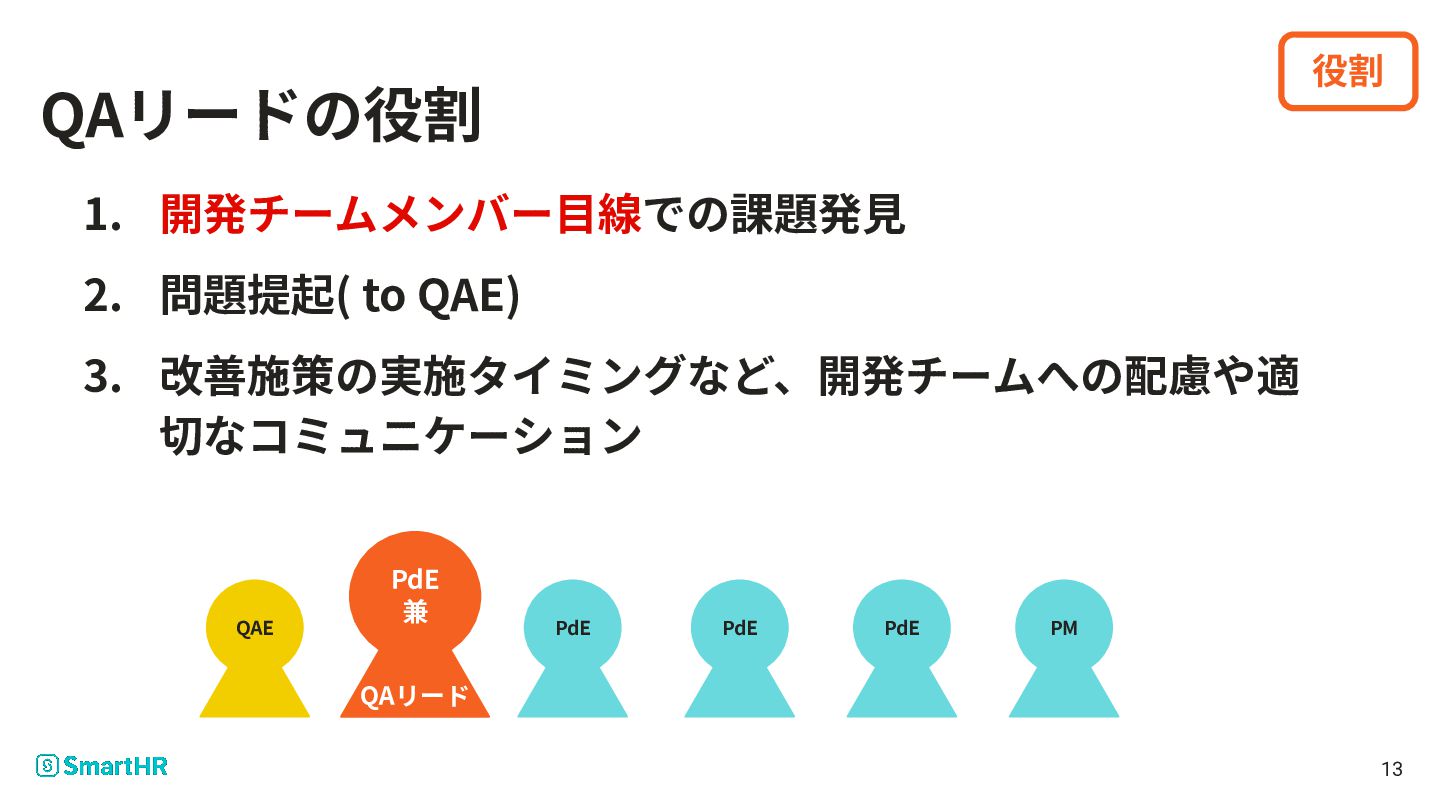 1. 開発チームメンバー⽬線での課題発⾒ 2. 問題提起( to QAE) 3. 改善施策の実施タイミングなど、開発チームへの配慮や適 切なコミュニケーション 役割