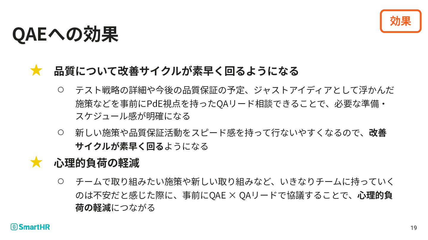 18 ★ 品質⾯における課題感を抱えたままにならない ◦ QAEが傍らにいないと握りつぶしてしまうような⼩さな課題感や違和感を気軽 に相談できる ★ ⾃然と品質について考える習慣が作られる ◦ QAEと共に開発チームの品質関連業務をリードすることから、品質について考え