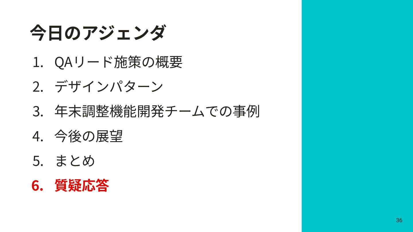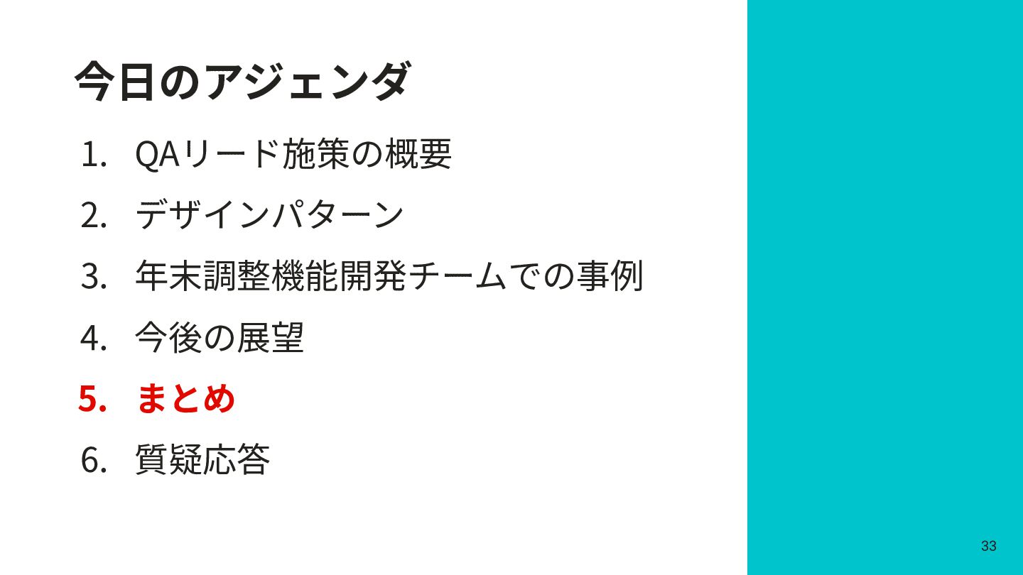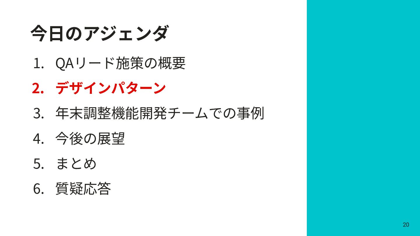 今⽇のアジェンダ 1. QAリード施策の概要 2. デザインパターン 3. 年末調整機能開発チームでの事例 4. 今後の展望 5.