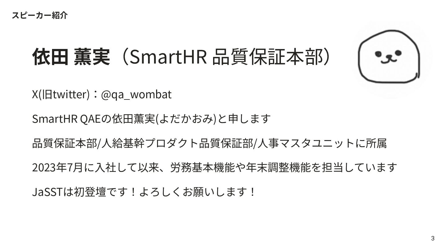 依⽥ 薫実(SmartHR 品質保証本部) スピーカー紹介 X(旧twitter):@qa_wombat SmartHR QAEの依⽥薫実(よだかおみ)と申します 品質保証本部/⼈給基幹プロダクト品質保証部/⼈事マスタユニットに所属 2023年7⽉に⼊社して以来、労務基本機能や年末調整機能を担当しています JaSSTは初登壇です!よろしくお願いします!