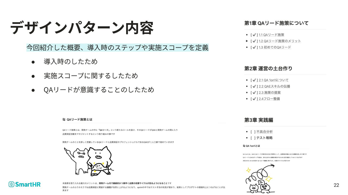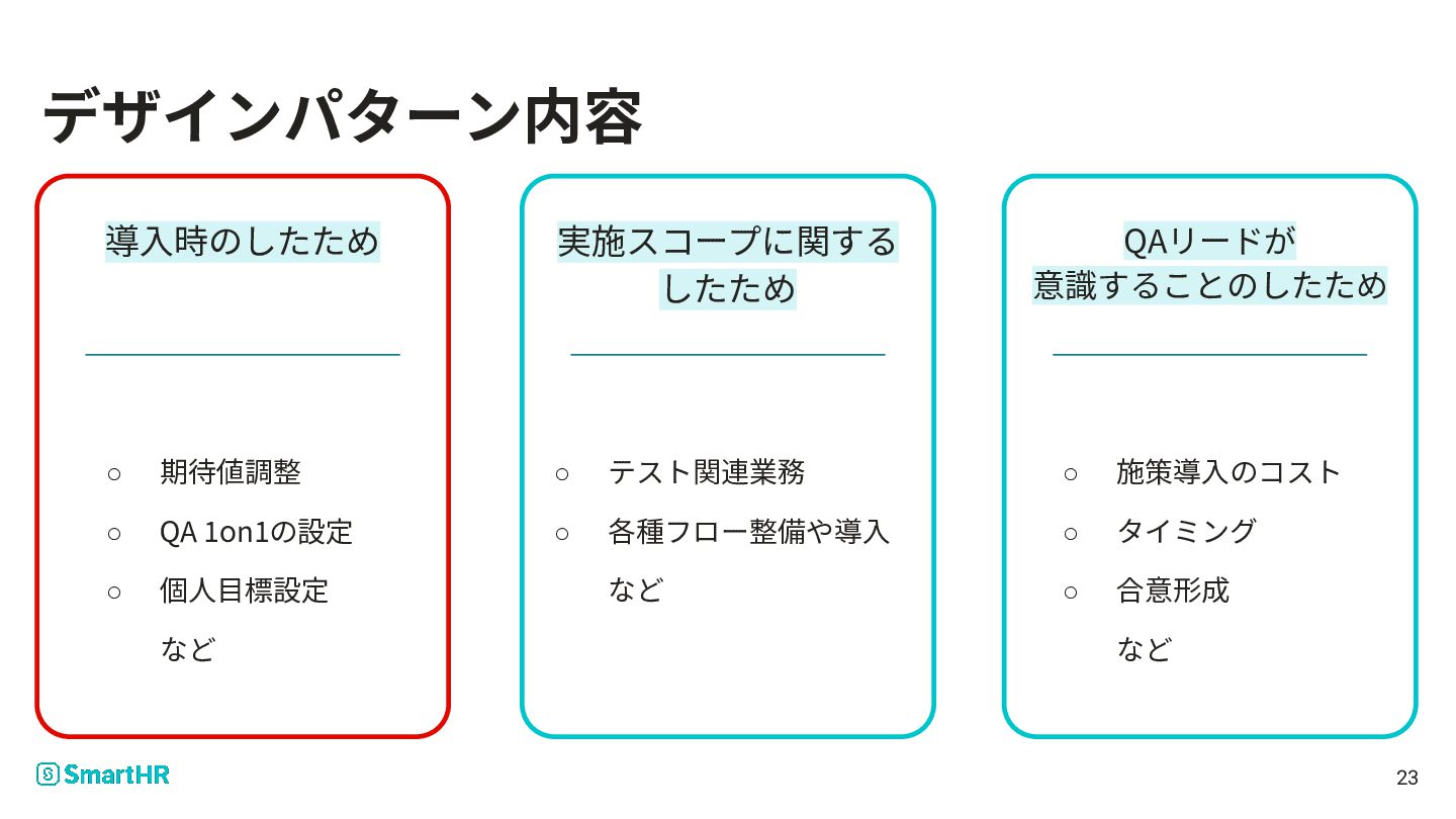 今回紹介した概要、導⼊時のステップや実施スコープを定義 • 導⼊時のしたため • 実施スコープに関するしたため • QAリードが意識することのしたため デザインパターン内容 22
