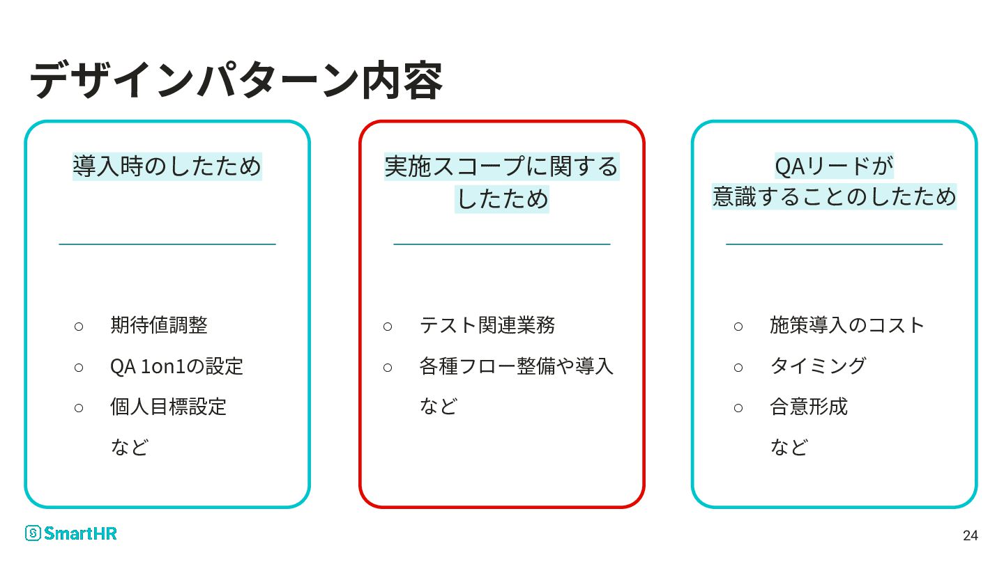 デザインパターン内容 23 ◦ テスト関連業務 ◦ 各種フロー整備や導⼊ など ◦ 施策導⼊のコスト ◦ タイミング ◦ 合意形成 など 導⼊時のしたため 実施スコープに関する したため