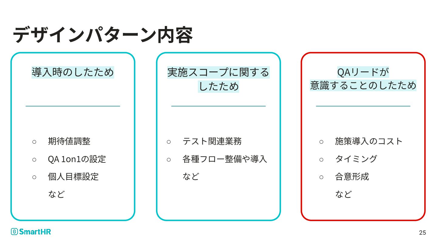 ◦ 期待値調整 ◦ QA 1on1の設定 ◦ 個⼈⽬標設定 など デザインパターン内容 24