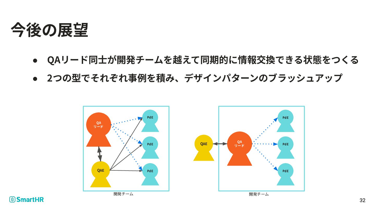 今後の展望 32 • QAリード同⼠が開発チームを越えて同期的に情報交換できる状態をつくる • 2つの型でそれぞれ事例を積み、デザインパターンのブラッシュアップ 32 QA リード QAE