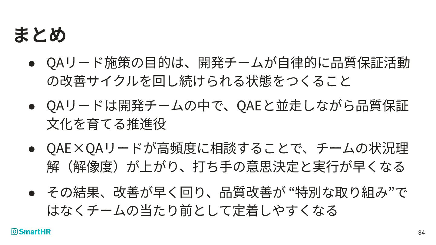 34 まとめ • QAリード施策の⽬的は、開発チームが⾃律的に品質保証活動 の改善サイクルを回し続けられる状態をつくること • QAリードは開発チームの中で、QAEと並⾛しながら品質保証 ⽂化を育てる推進役 • QAE×QAリードが⾼頻度に相談することで、チームの状況理