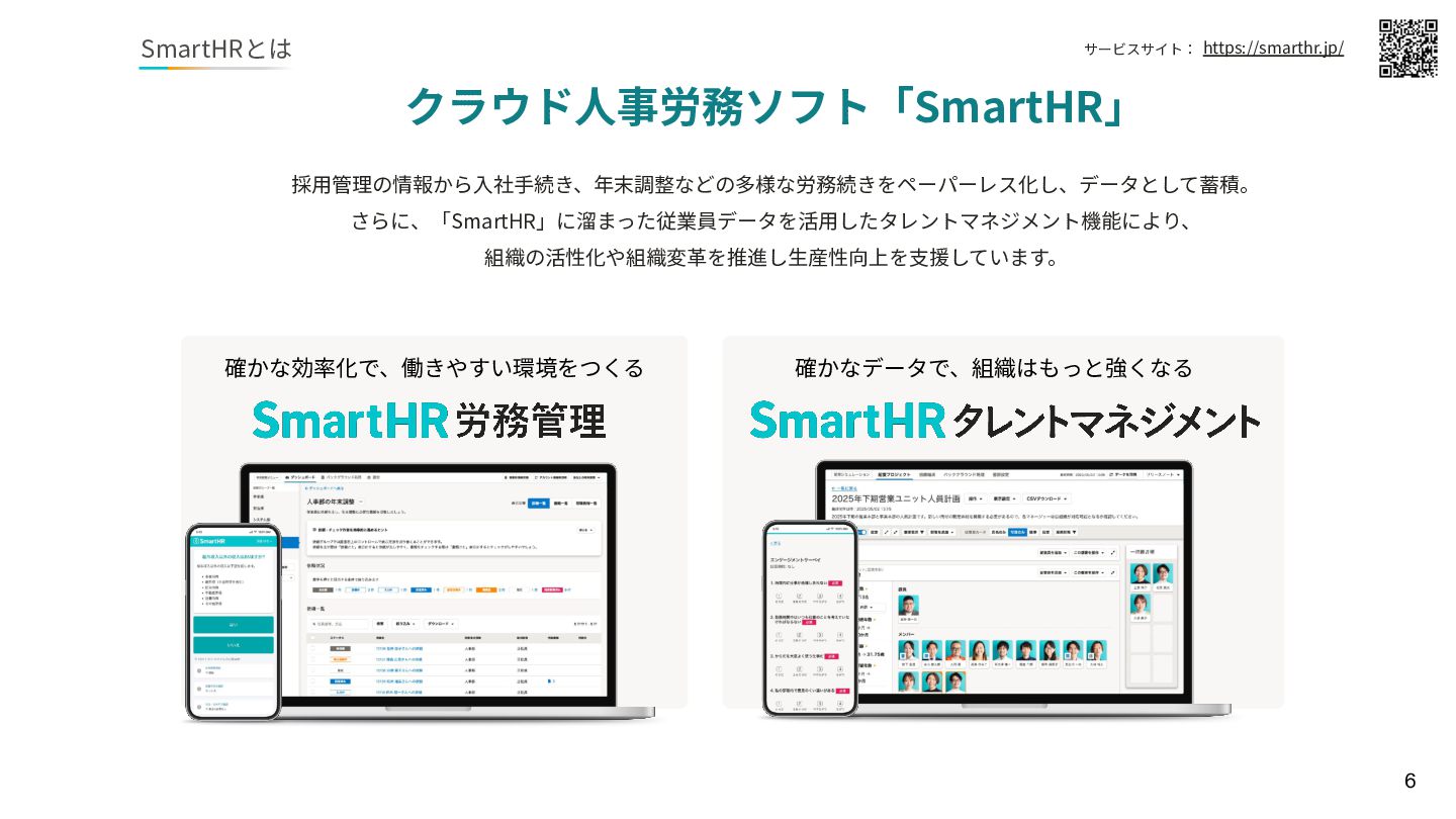 サービスサイト: https://smarthr.jp/ SmartHRとは 確かな効率化で、働きやすい環境をつくる 確かなデータで、組織はもっと強くなる クラウド⼈事労務ソフト「SmartHR」 採⽤管理の情報から⼊社⼿続き、年末調整などの多様な労務続きをペーパーレス化し、データとして蓄積。 さらに、「SmartHR」に溜まった従業員データを活⽤したタレントマネジメント機能により、 組織の活性化や組織変⾰を推進し⽣産性向上を⽀援しています。 13