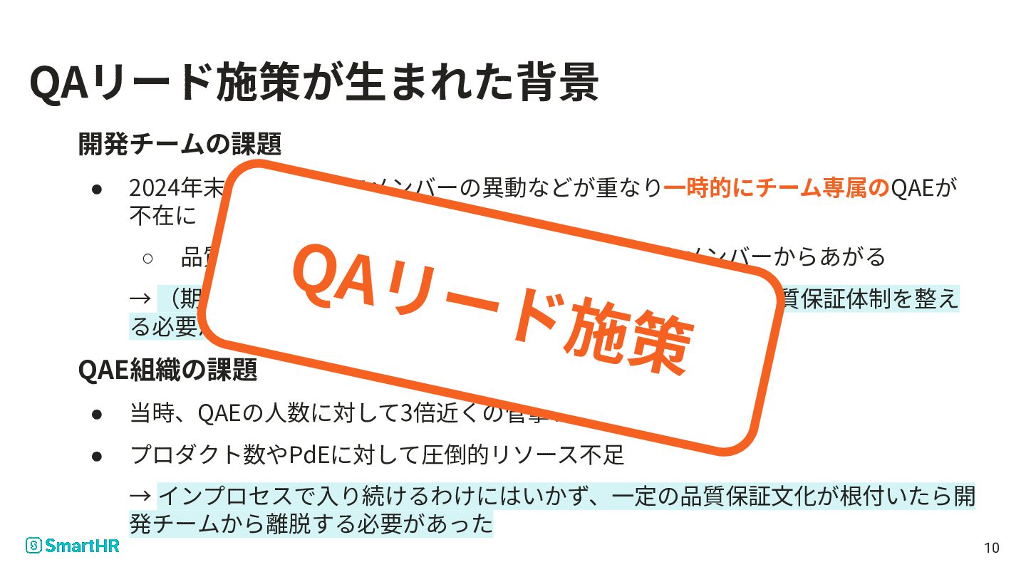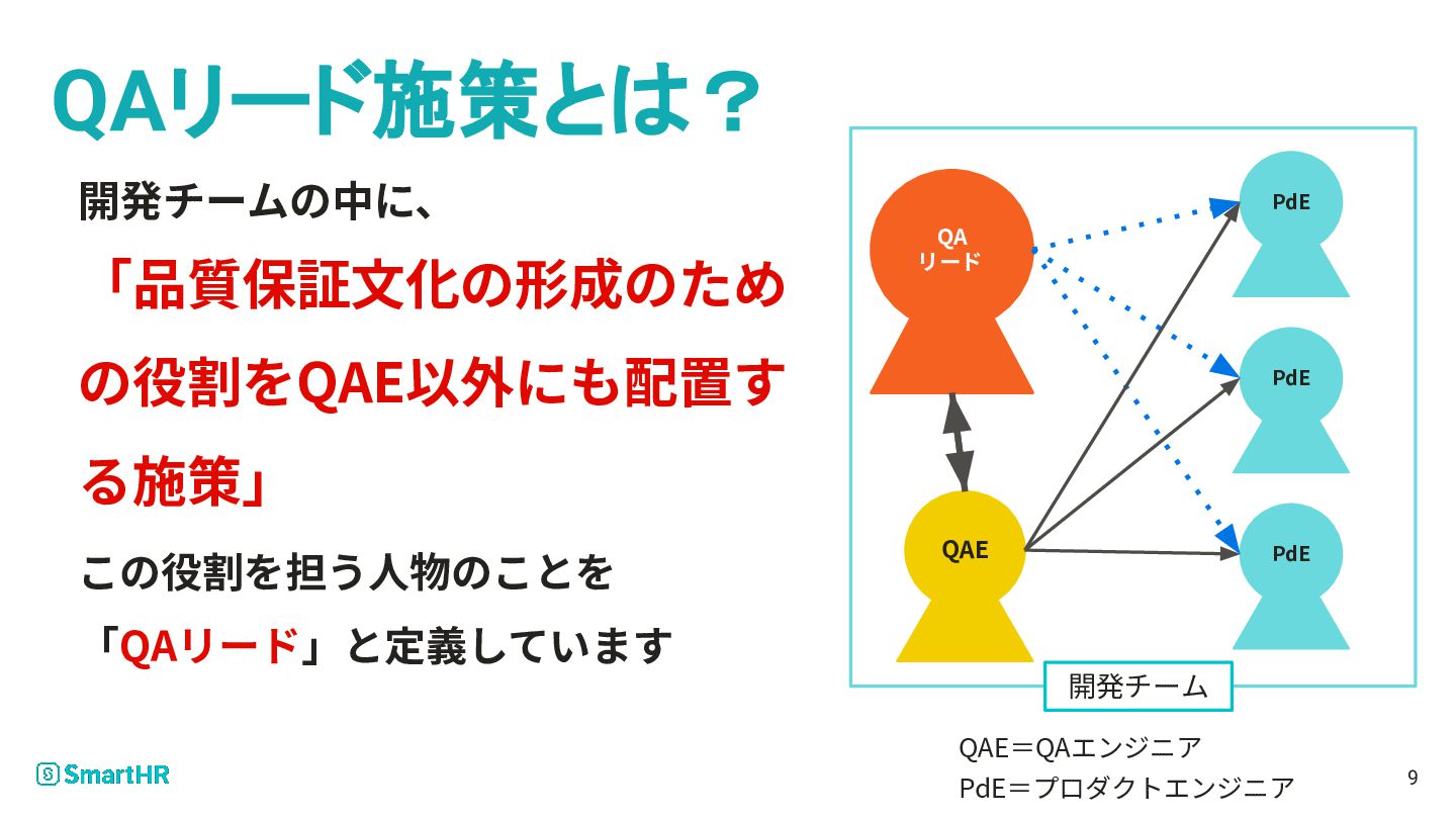 9 QAリード施策とは? 開発チームの中に、 「品質保証⽂化の形成のため の役割をQAE以外にも配置す る施策」 この役割を担う⼈物のことを 「QAリード」と定義しています QA リード
