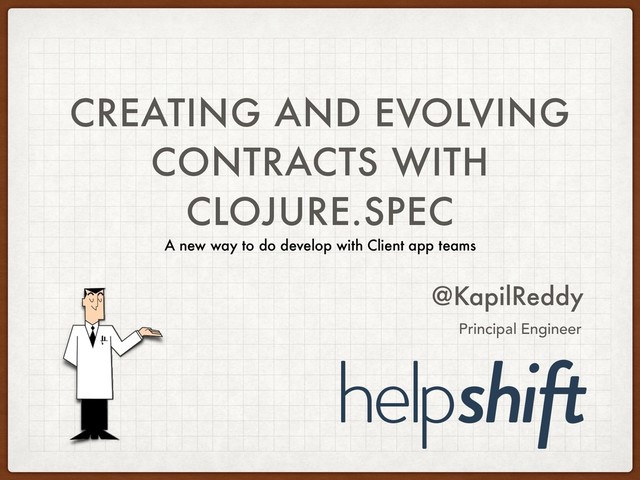 write contracts in Clojure + Spec with help from Frontend engineers • Both start work in parallel • Both checkpoint and verify against Spec • Integrate and test flows when both pieces are ready