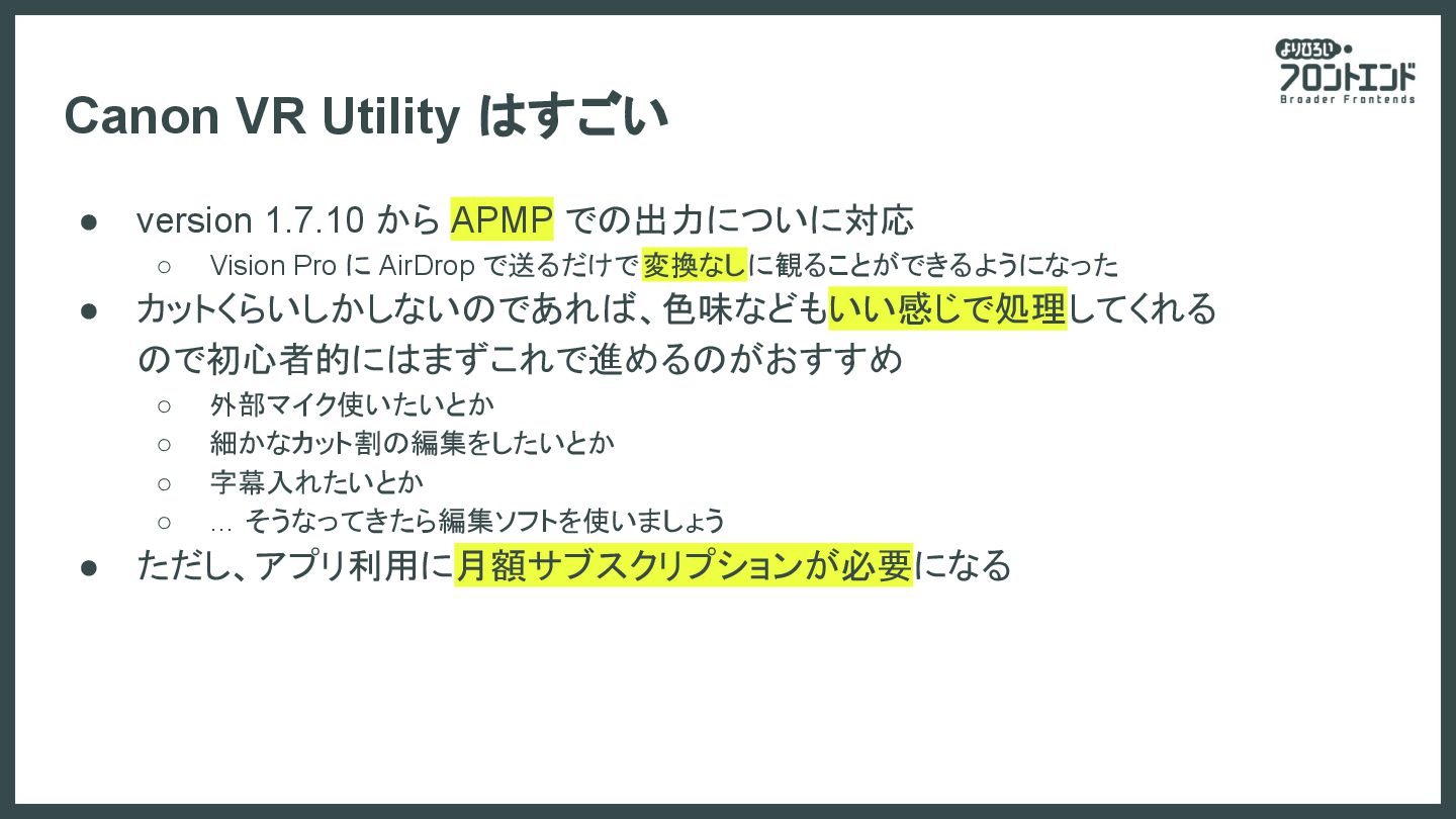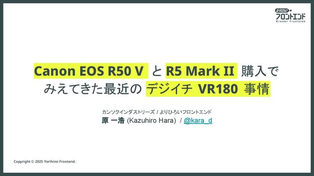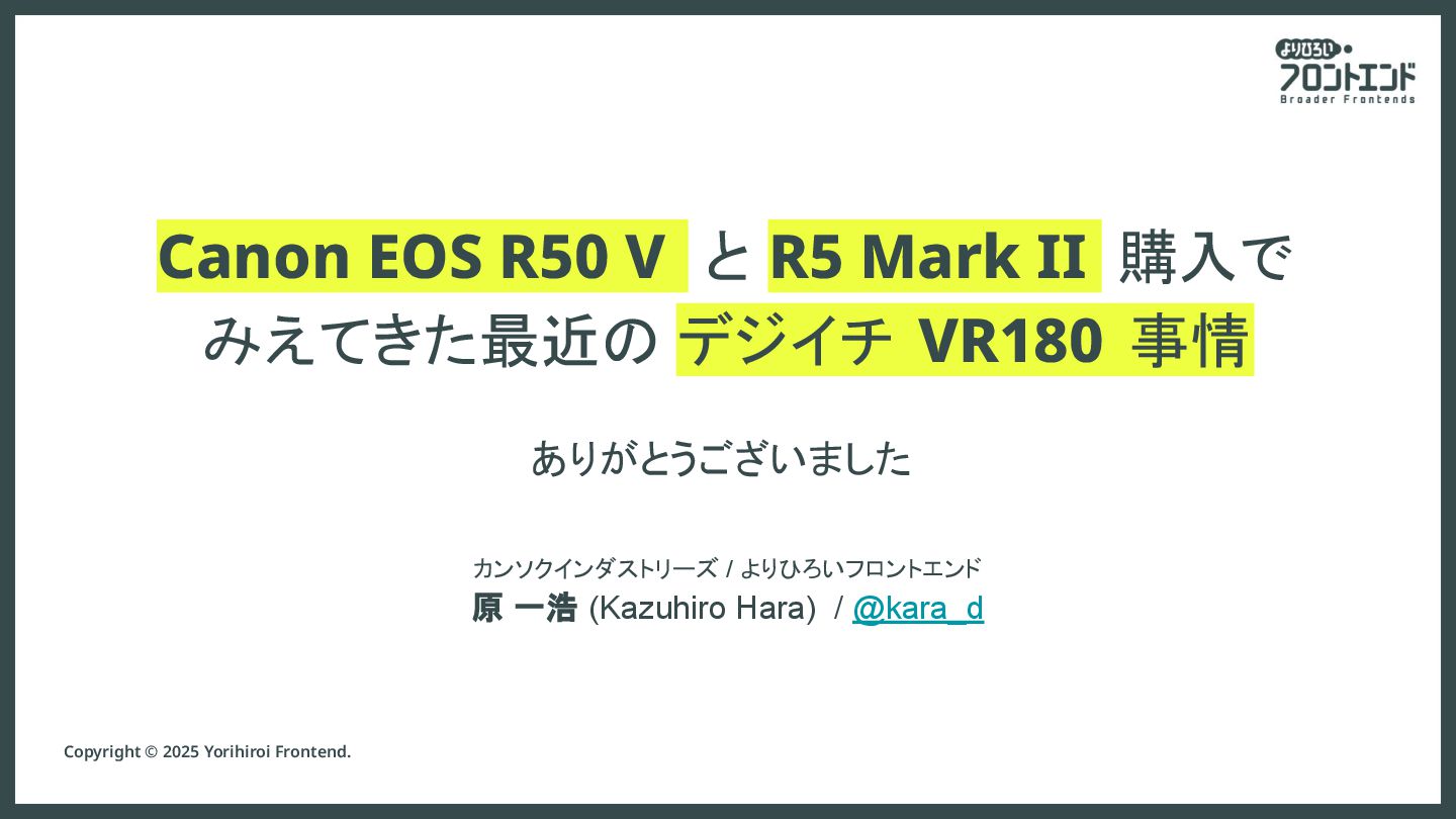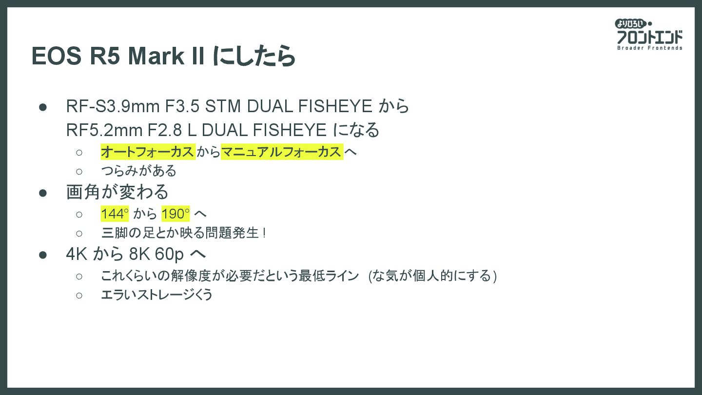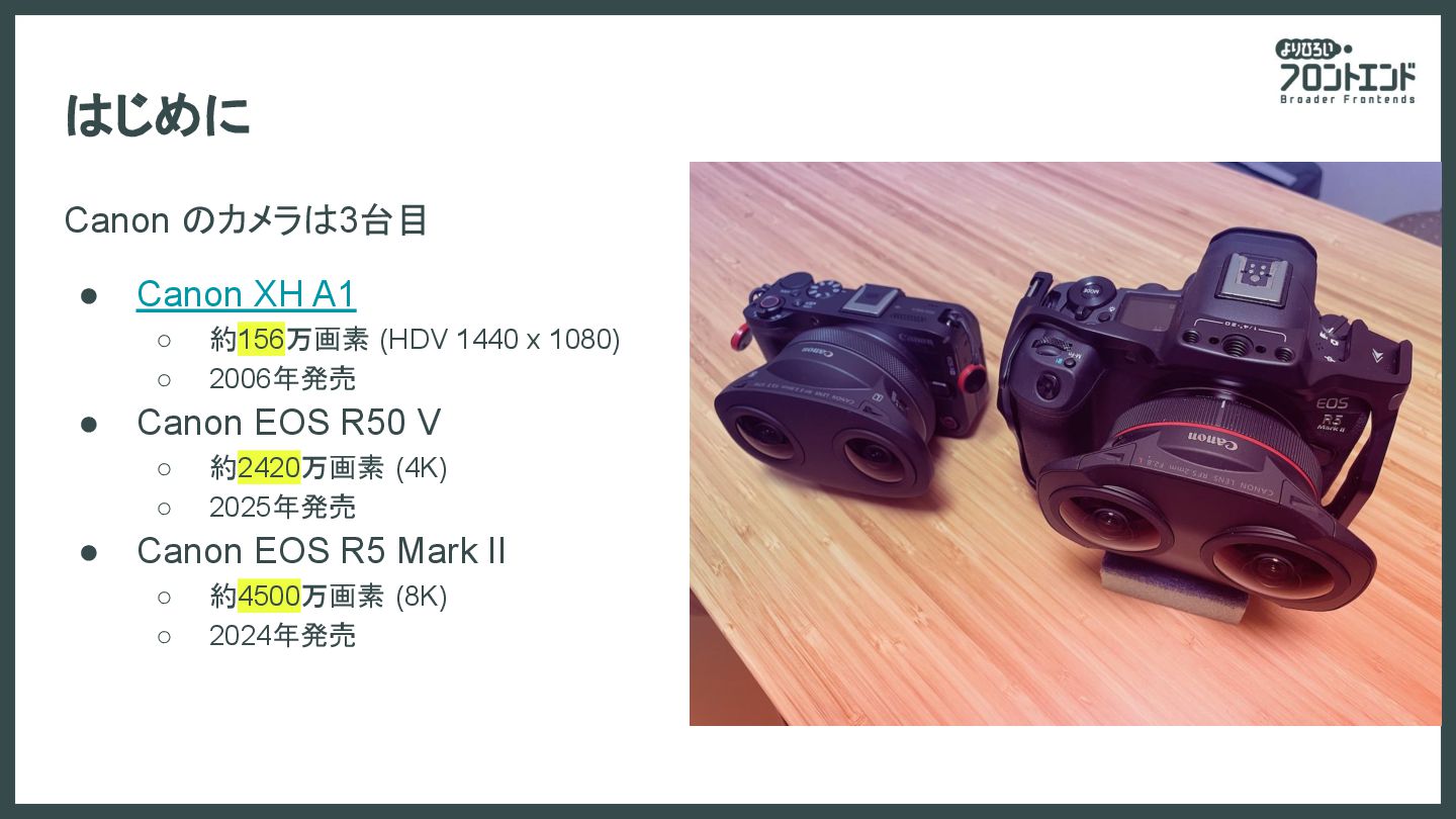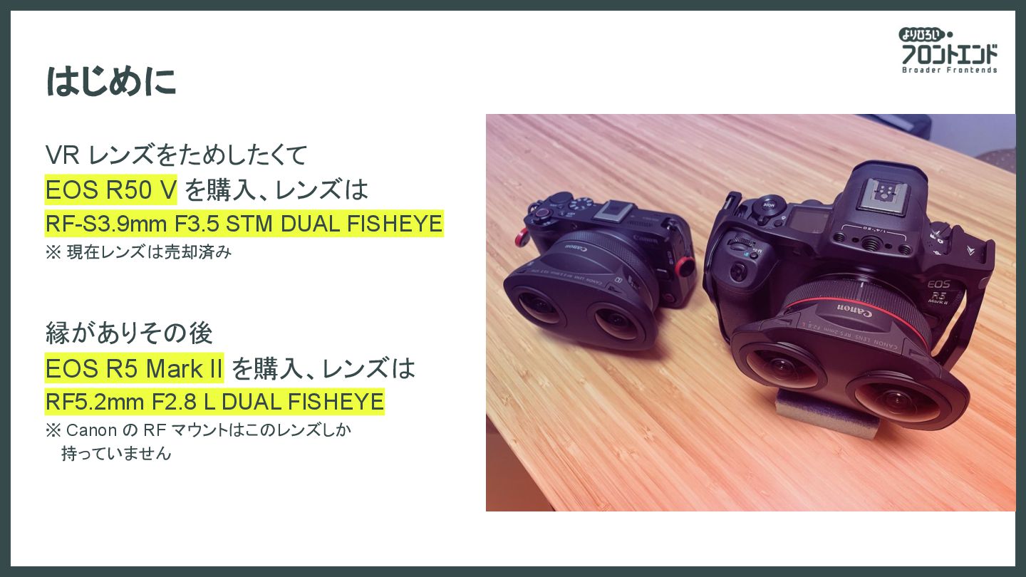 Canon EOS R50 V と R5 Mark II 、そして VR レンズである RF5.2mm F2.8 L DUAL FISHEYE および RF-S3.9mm F3.5 STM DUAL FISHEYE の購入と Vision Pro での表示検証を通して見えてきた Canon のデジイチにおける VR180 の現状について語ります。また、筐体比較用として大昔に購入した Canon XH A1 (https://shorturl.at/LSOsm) も持っていきます。