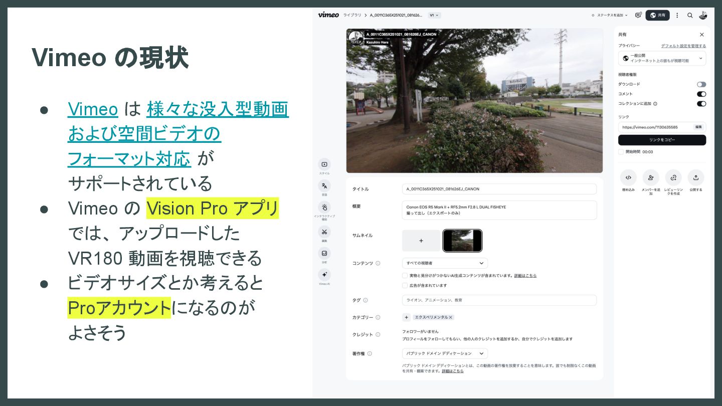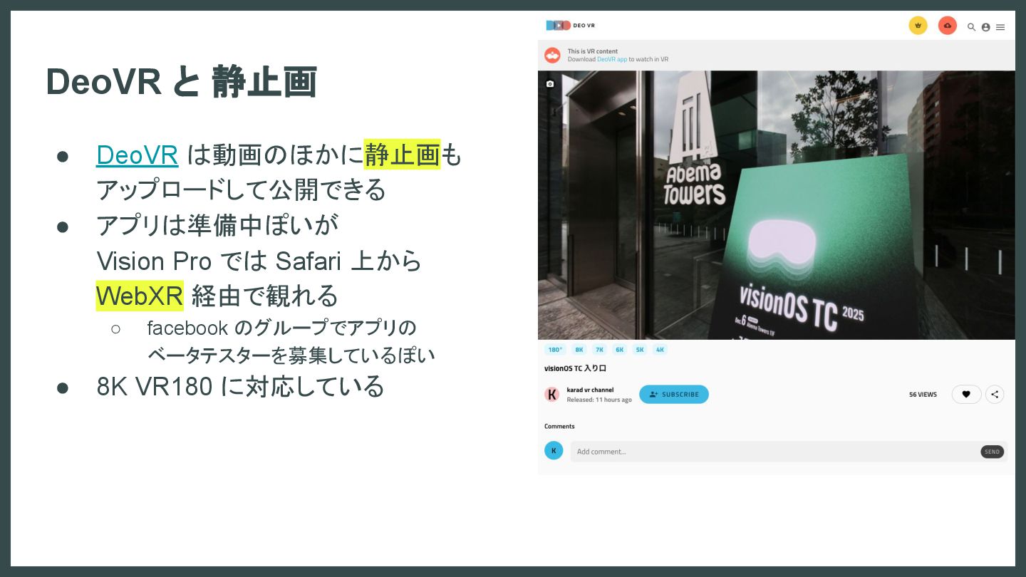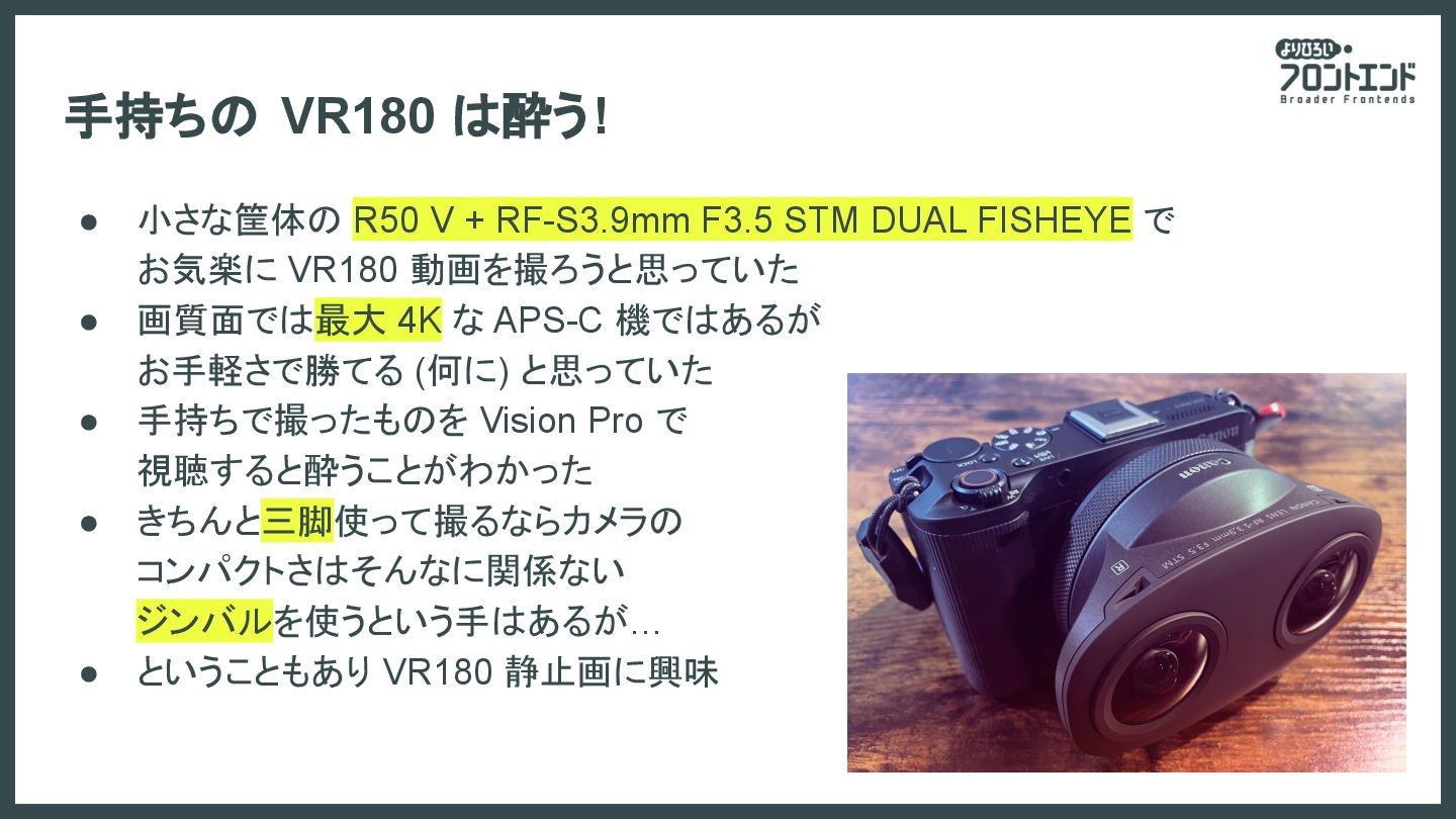 また、XR Kaigi と visionOS TC への参加を通して得られた様々な交流を経て思い至ったデジイチにおける VR180 静止画の可能性について考えます。