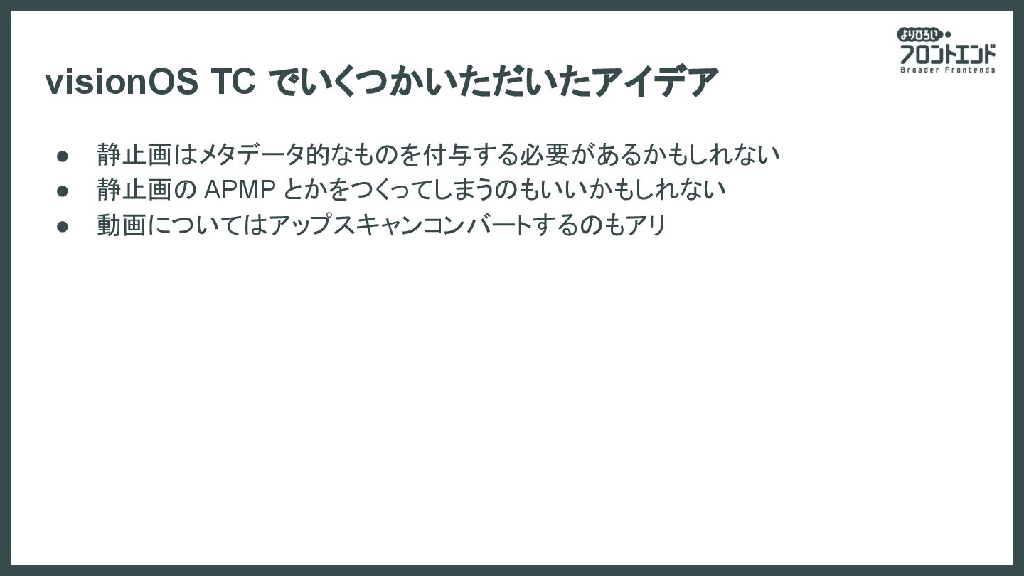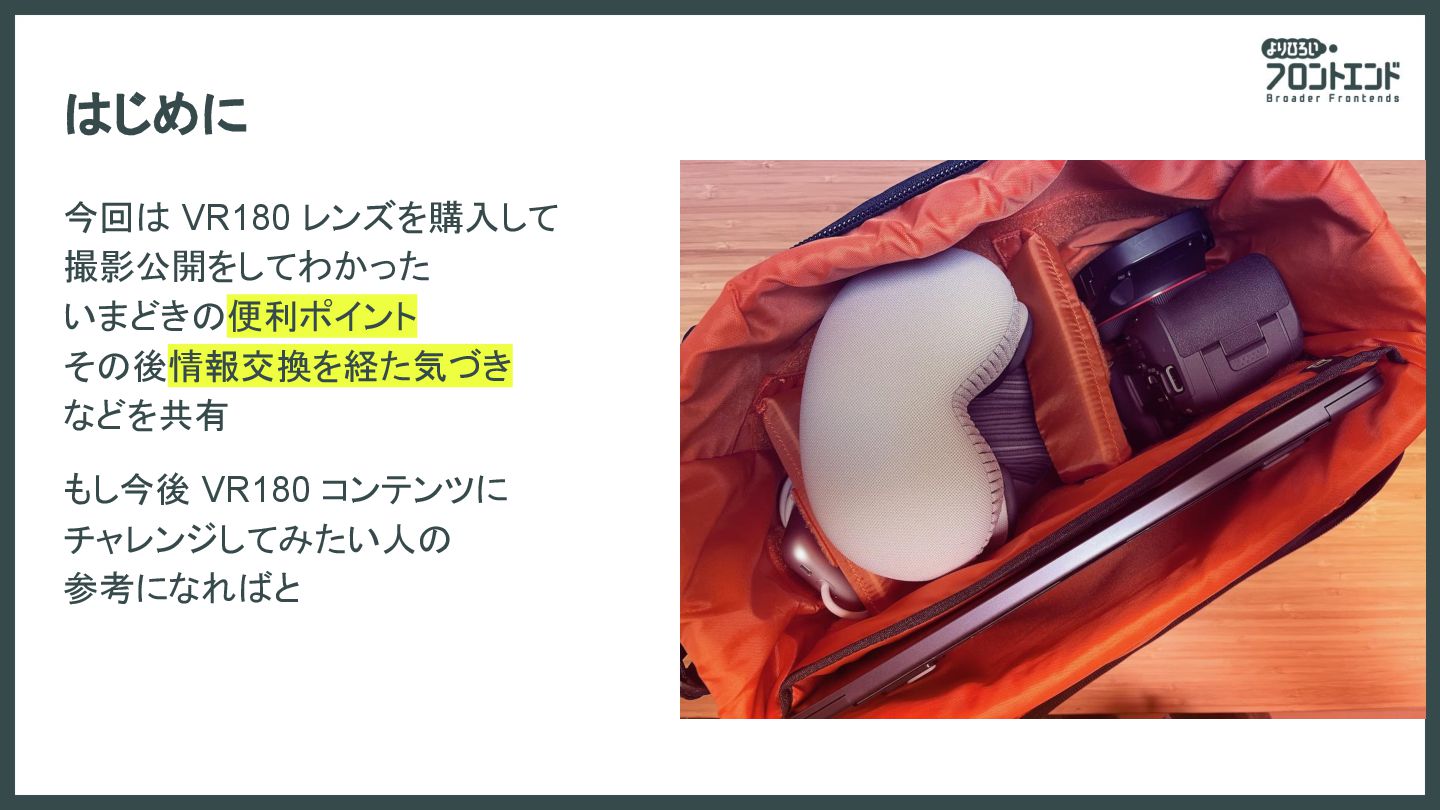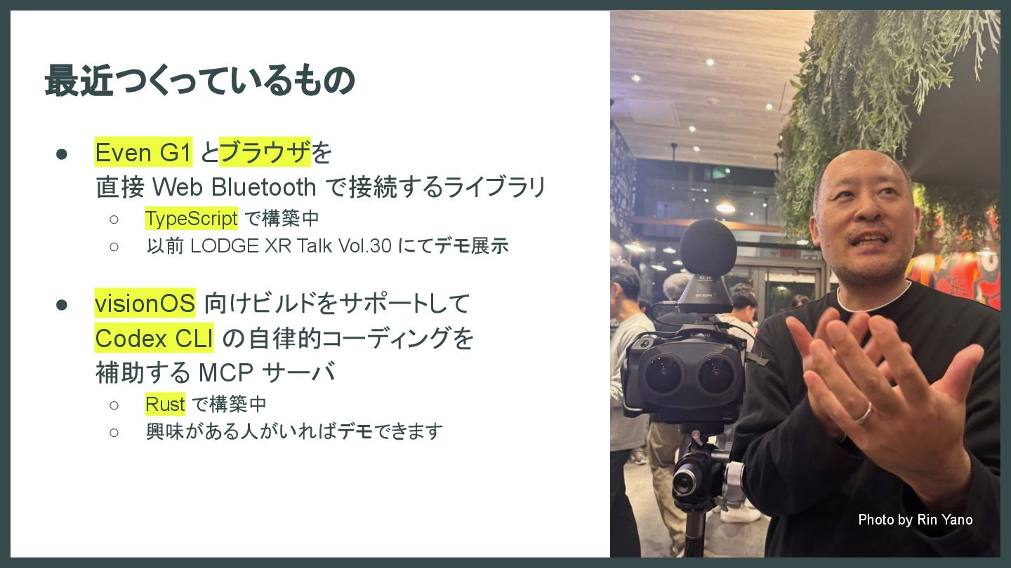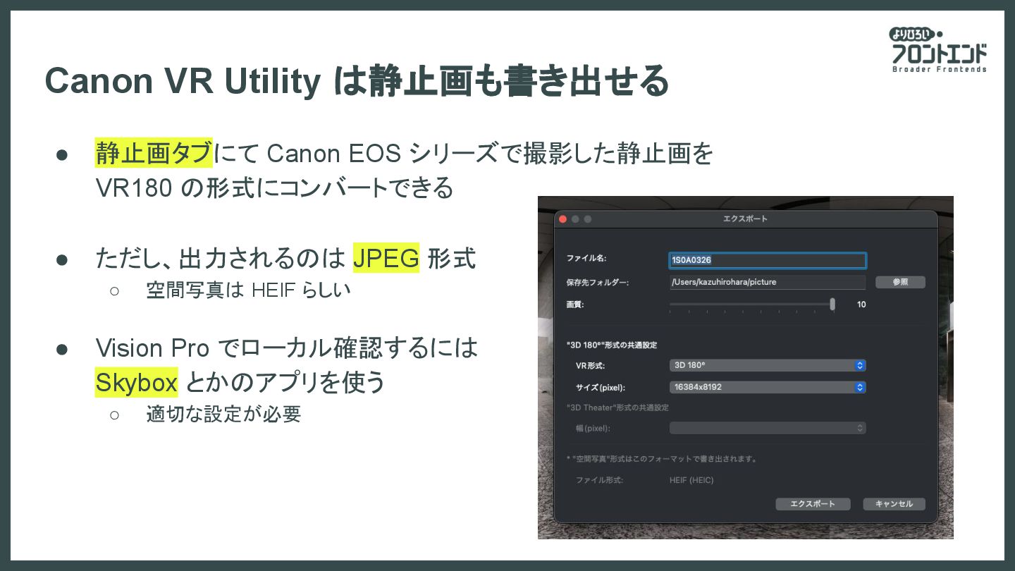 また、XR Kaigi と visionOS TC への参加を通して得られた様々な交流を経て思い至ったデジイチにおける VR180 静止画の可能性について考えます。
