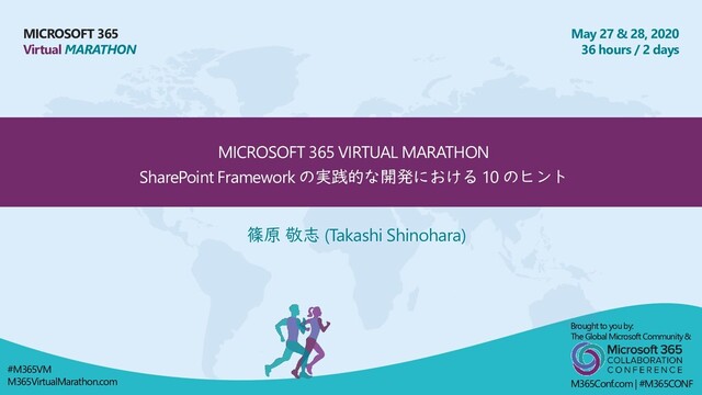 hours / 2 days MICROSOFT 365 VIRTUAL MARATHON SharePoint Framework の実践的な開発における 10 のヒント 篠原 敬志 (Takashi Shinohara) Brought to you by: The Global Microsoft Community & M365Conf.com | #M365CONF #M365VM M365VirtualMarathon.com