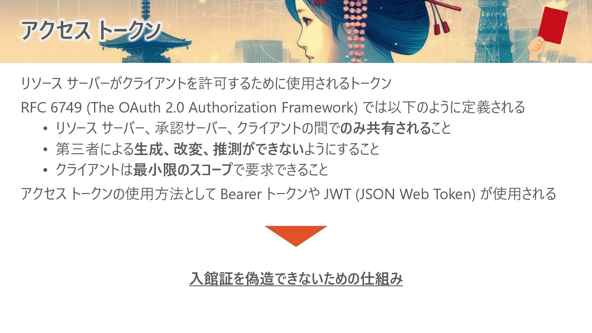 Framework) では以下のように定義される • リソース サーバー、承認サーバー、クライアントの間でのみ共有されること • 第三者による生成、改変、推測ができないようにすること • クライアントは最小限のスコープで要求できること アクセス トークンの使用方法として Bearer トークンや JWT (JSON Web Token) が使用される 入館証を偽造できないための仕組み