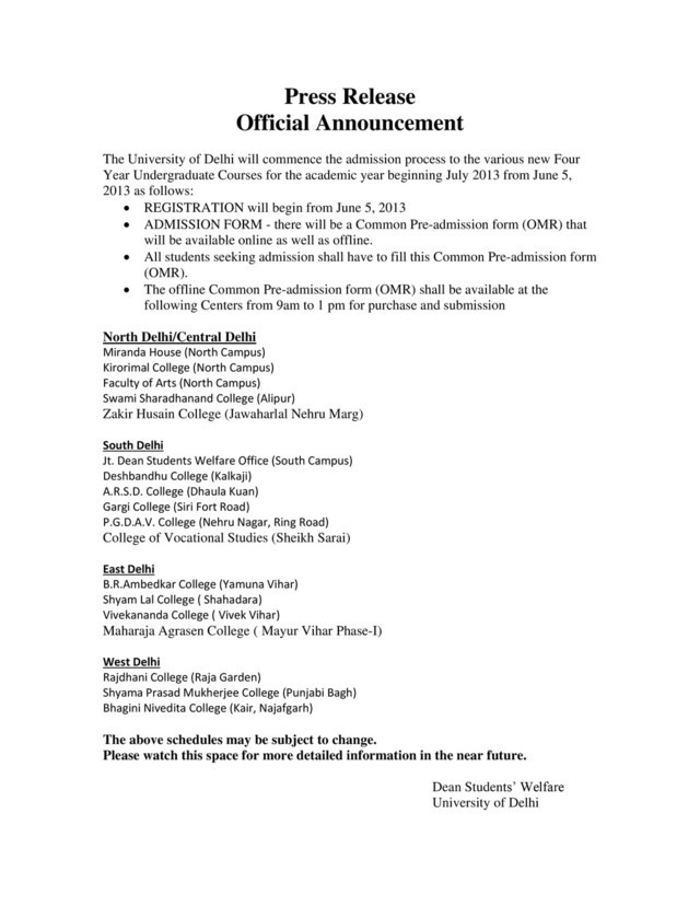 the admission process to the various new Four Year Undergraduate Courses for the academic year beginning July 2013 from June 5, 2013 as follows: REGISTRATION will begin from June 5, 2013 ADMISSION FORM - there will be a Common Pre-admission form (OMR) that will be available online as well as offline. All students seeking admission shall have to fill this Common Pre-admission form (OMR). The offline Common Pre-admission form (OMR) shall be available at the following Centers from 9am to 1 pm for purchase and submission North Delhi/Central Delhi Miranda House (North Campus) Kirorimal College (North Campus) Faculty of Arts (North Campus) Swami Sharadhanand College (Alipur) Zakir Husain College (Jawaharlal Nehru Marg) South Delhi Jt. Dean Students Welfare Office (South Campus) Deshbandhu College (Kalkaji) A.R.S.D. College (Dhaula Kuan) Gargi College (Siri Fort Road) P.G.D.A.V. College (Nehru Nagar, Ring Road) College of Vocational Studies (Sheikh Sarai) East Delhi B.R.Ambedkar College (Yamuna Vihar) Shyam Lal College ( Shahadara) Vivekananda College ( Vivek Vihar) Maharaja Agrasen College ( Mayur Vihar Phase-I) West Delhi Rajdhani College (Raja Garden) Shyama Prasad Mukherjee College (Punjabi Bagh) Bhagini Nivedita College (Kair, Najafgarh) The above schedules may be subject to change. Please watch this space for more detailed information in the near future. Dean Students’ Welfare University of Delhi
