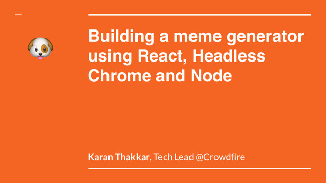 Chrome recently launched cross platform support for Headless mode from Chrome 59 onwards. There has already been a lot of buzz regarding the variety of use cases that can be achieved with it like automated testing, screenshot/pdf generation, access to all of devtools features using the devtools protocol including audits, performance, coverage, etc. Having previously built an image generation service using phantomjs, I wanted to see how complex it was to do something similar using headless chrome. The talk involves building a minimal meme generator using: React(for meme preview), Node & Hapi(for API server) and Headless Chrome (for image generation)